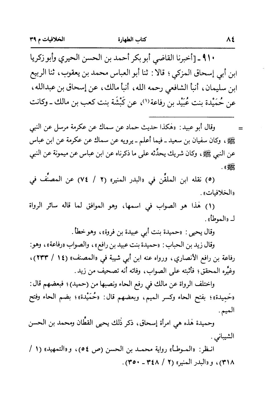 910- [أخبرنا القاضي أبو بكر أحمد بن الحسن الحيري وأبو زكريا ابن أبي إسحاق المزكي؛ قالا: ثنا أبو العباس محمد بن يعقوب، ثنا الربيع ابن سليمان، أنبأ الشافعي رحمه الله، أنبأ مالك، عن إسحاق بن عبد الله، عن حميدة بنت عبيد بن رفاعة، عن كبشة بنت كعب بن مالك -وكانت
