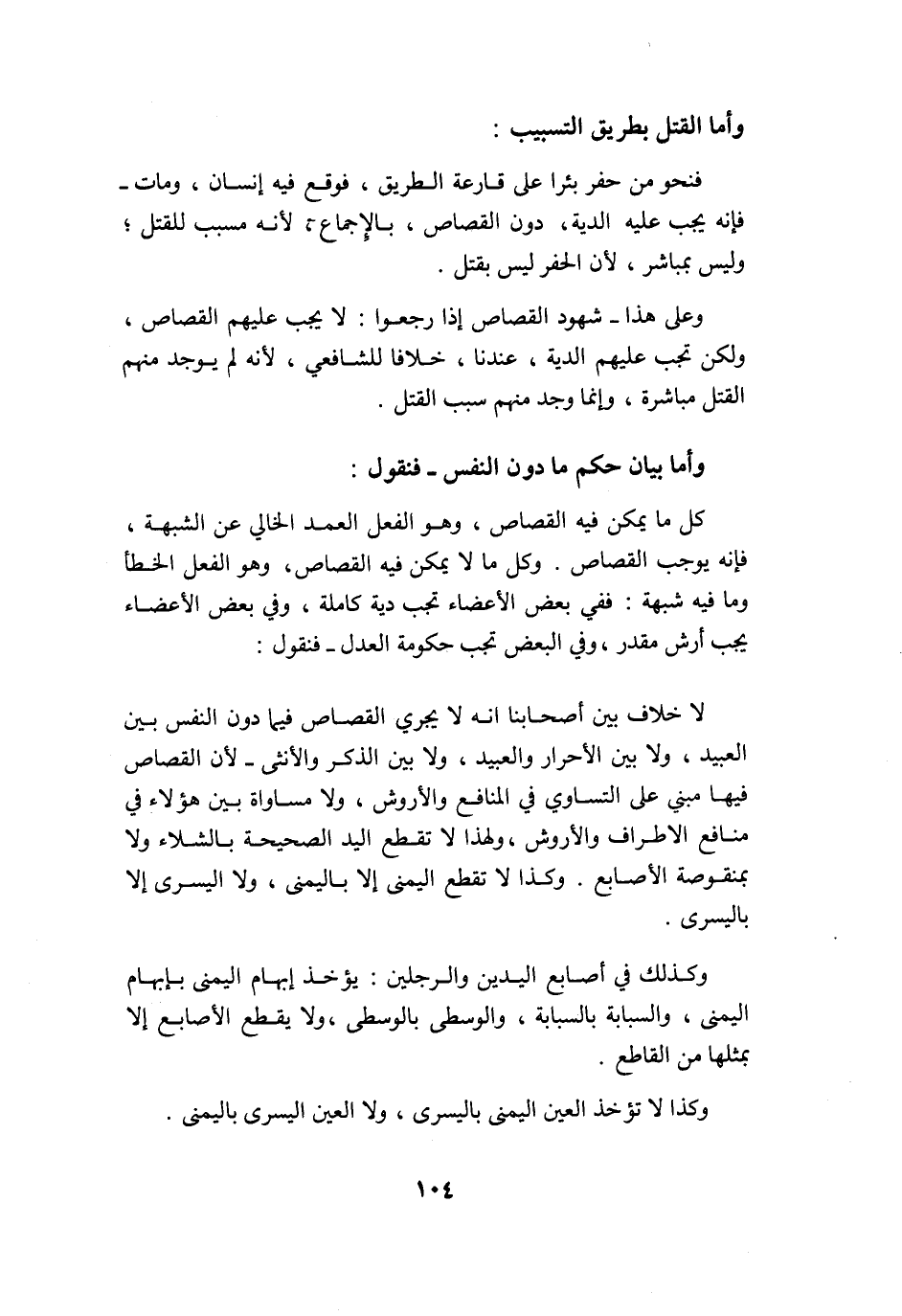 وكل مَا لَا يُمكن الْقصاص وَهُوَ الْفِعْل الْخَطَأ وَمَا فِيهِ شُبْهَة فَفِي بعض الْأَعْضَاء تجب دِيَة كَامِلَة وَفِي بعض الْأَعْضَاء يجب أرش مُقَدّر وَفِي الْبَعْض تجب حُكُومَة الْعدْل فَنَقُول لَا خلاف بَين أَصْحَابنَا أَنه لَا يجْرِي الْقصاص فِيمَا دون النَّفس بَين العبيد وَلَا بَين الْأَحْرَار وَالْعَبِيد وَلَا بَين الذّكر وَالْأُنْثَى لِأَن الْقصاص فِيهَا مَبْنِيّ على التَّسَاوِي فِي الْمَنَافِع والأروش وَلَا مُسَاوَاة بَين هَؤُلَاءِ فِي مَنَافِع الْأَطْرَاف والأروش وَلِهَذَا لَا تقطع الْيَد الصَّحِيحَة بالشلاء وَلَا بمنقوصة الْأَصَابِع