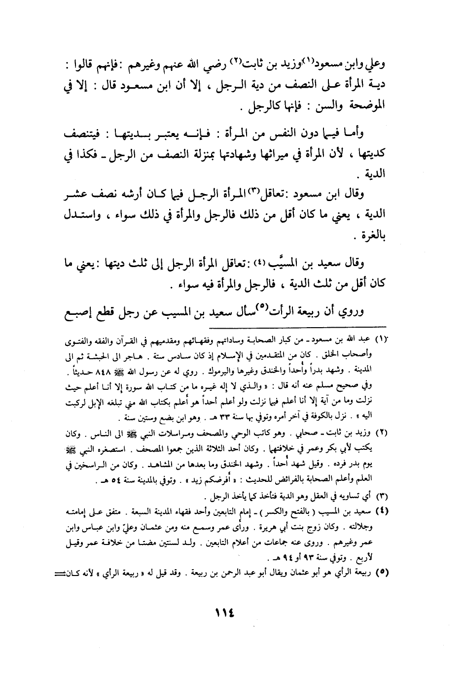 وَعلي وَابْن مَسْعُود وَزيد بن ثَابت رَضِي الله عَنْهُم وَغَيرهم فَإِنَّهُم قَالُوا دِيَة الْمَرْأَة على النّصْف من دِيَة الرجل إِلَّا أَن ابْن مَسْعُود قَالَ إِلَّا فِي الْمُوَضّحَة وَالسّن فَإِنَّهَا كَالرّجلِ