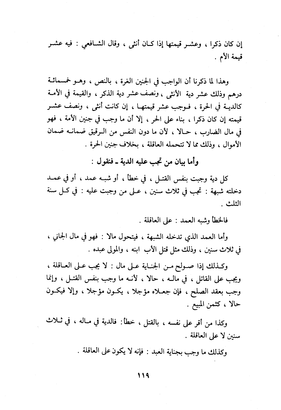 وَأما بَيَان من تجب عَلَيْهِ الدِّيَة فَنَقُول كل دِيَة وَجَبت بِنَفس الْقَتْل فِي خطأ أَو شبة عمد أَو فِي عمد دَخلته شبهه تجب فِي ثَلَاث سِنِين على من وَجَبت عَلَيْهِ فِي كل سنة الثُّلُث