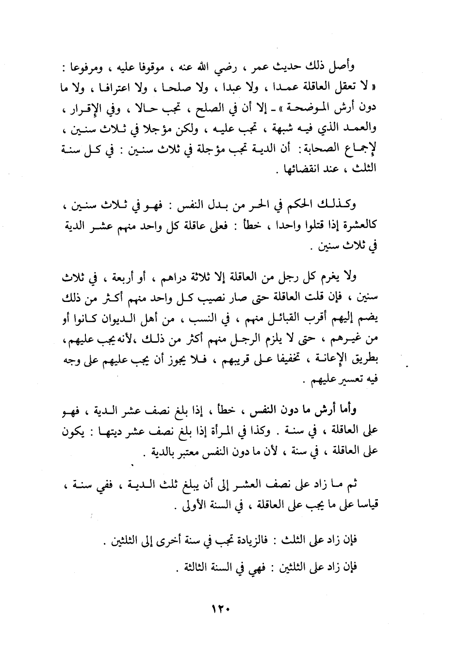 وأصل ذَلِك حَدِيث عمر رَضِي الله عَنهُ مَوْقُوفا عَلَيْهِ وَمَرْفُوعًا لَا تعقل الْعَاقِلَة عمدا وَلَا عبدا وَلَا صلحا وَلَا اعترافا وَلَا مَا دون أرش الْمُوَضّحَة إِلَّا أَن فِي الصُّلْح تجب حَالا وَفِي الْإِقْرَار والعمد الَّذِي فِيهِ شُبْهَة تجب عَلَيْهِ وَلَكِن مُؤَجّلا فِي ثَلَاث سِنِين لإِجْمَاع الصَّحَابَة أَن الدِّيَة تجب مُؤَجّلَة فِي ثَلَاث سِنِين فِي كل سنة الثُّلُث عِنْد انْقِضَائِهَا