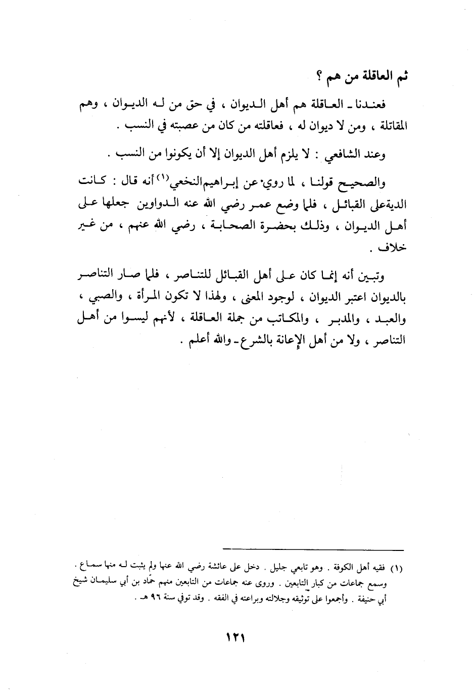 وَتبين أَنه إِنَّمَا كَانَ على أهل الْقَبَائِل للتناصر فَلَمَّا صَار التناصر بالديوان اعْتبر الدِّيوَان لوُجُود الْمَعْنى وَلِهَذَا لَا تكون الْمَرْأَة وَالصَّبِيّ وَالْعَبْد وَالْمُدبر وَالْمكَاتب من جملَة الْعَاقِلَة لأَنهم لَيْسُوا من أهل التناصر وَلَا من أهل الْإِعَانَة بِالشَّرْعِ وَالله أعلم
