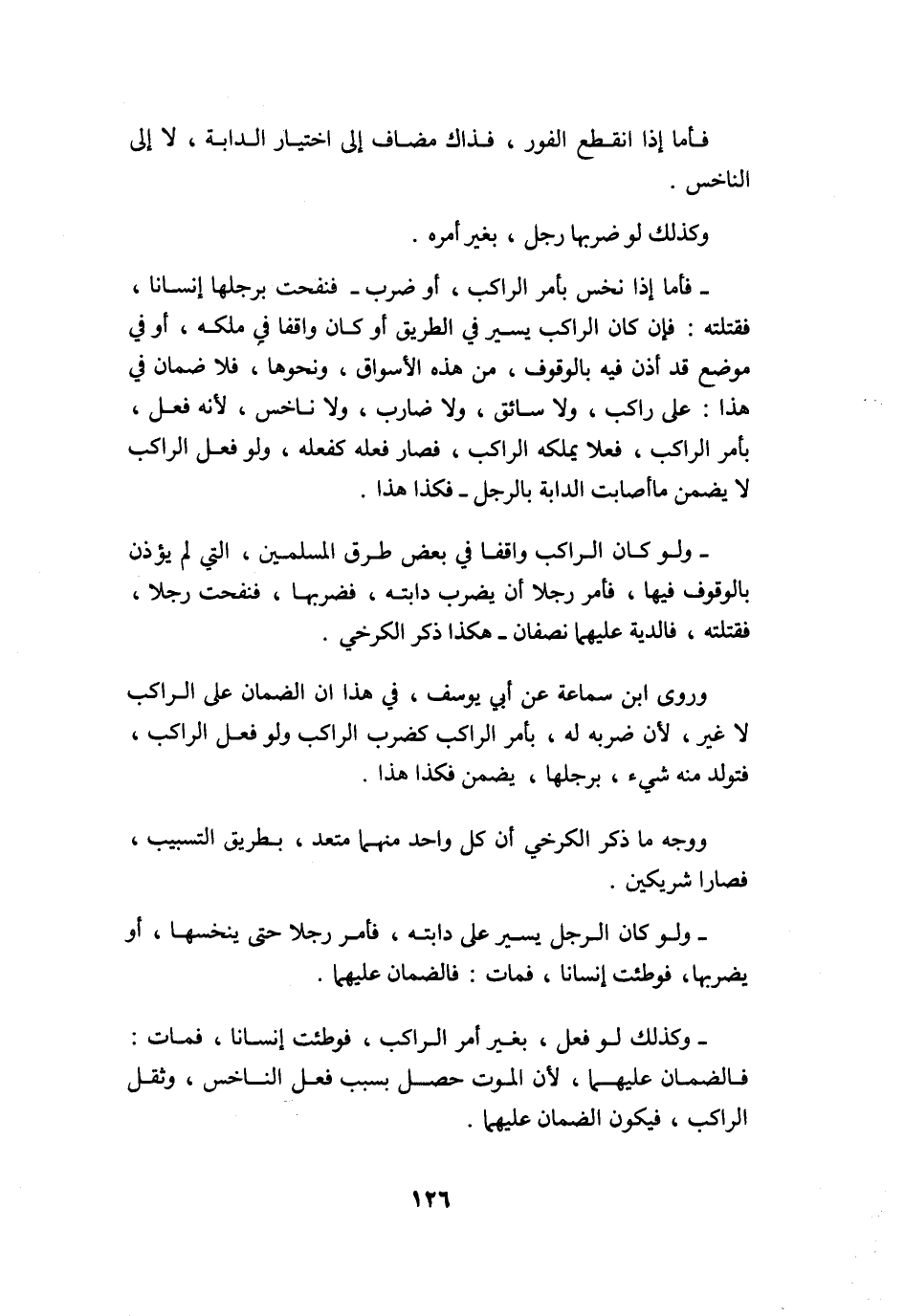 فَأَما إِذا نخس بِأَمْر الرَّاكِب أَو ضرب فنفحت برجلها إنْسَانا فَقتلته فَإِن كَانَ الرَّاكِب يسير فِي الطَّرِيق أَو كَانَ وَاقِفًا فِي ملكه أَو فِي مَوضِع قد أذن فِيهِ بِالْوُقُوفِ من هَذِه الْأَسْوَاق وَنَحْوهَا فَلَا ضَمَان فِي هَذَا على رَاكب وَلَا سائق وَلَا ضَارب وَلَا ناخس لِأَنَّهُ فعل بِأَمْر الرَّاكِب فعلا يملكهُ الرَّاكِب فَصَارَ فعله كَفِعْلِهِ وَلَو فعل الرَّاكِب لَا يضمن مَا أَصَابَت الدَّابَّة بِالرجلِ فَكَذَا هَذَا