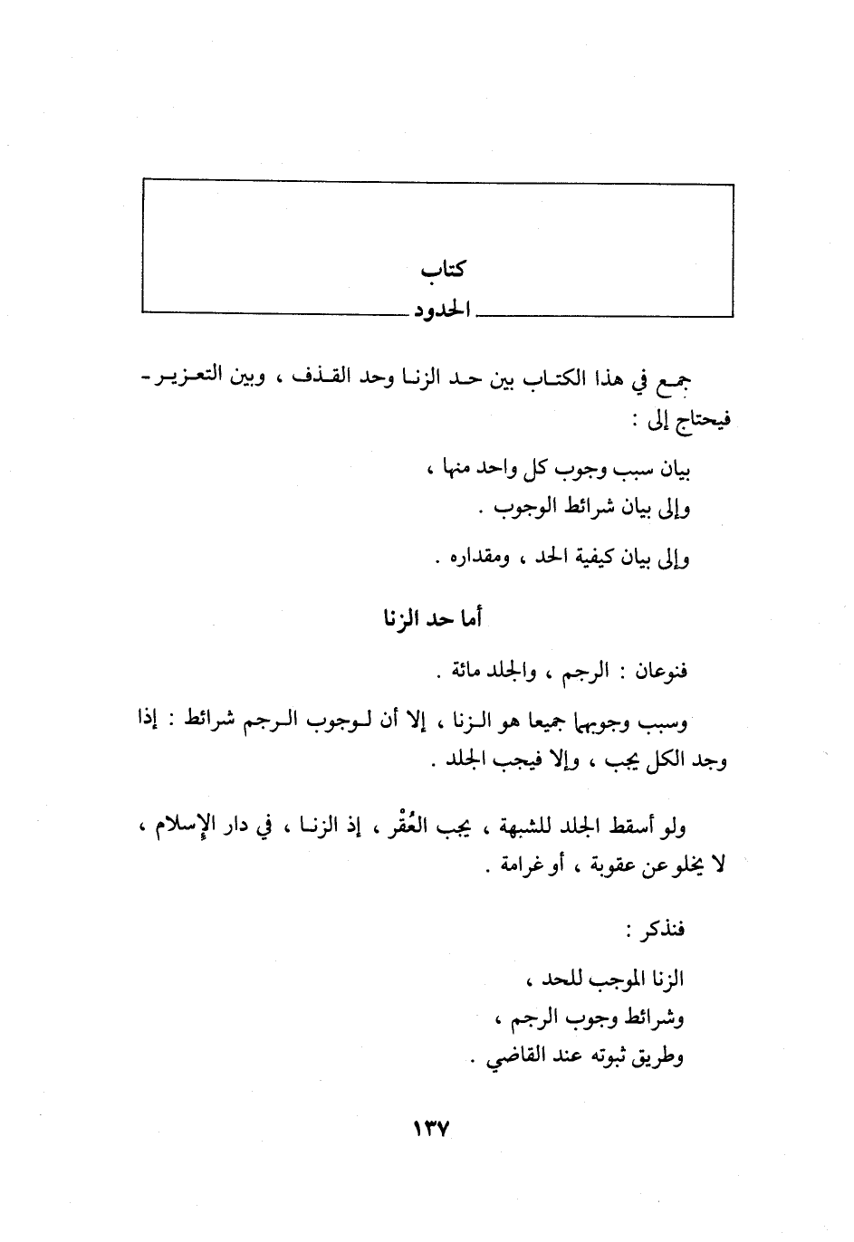 جمع فِي هَذَا الْكتاب بَين حد الزِّنَا وحد الْقَذْف وَبَين التَّعْزِير فَيحْتَاج إِلَى بَيَان سَبَب وجوب كل وَاحِد مِنْهَا وَإِلَى بَيَان شَرَائِط الْوُجُوب