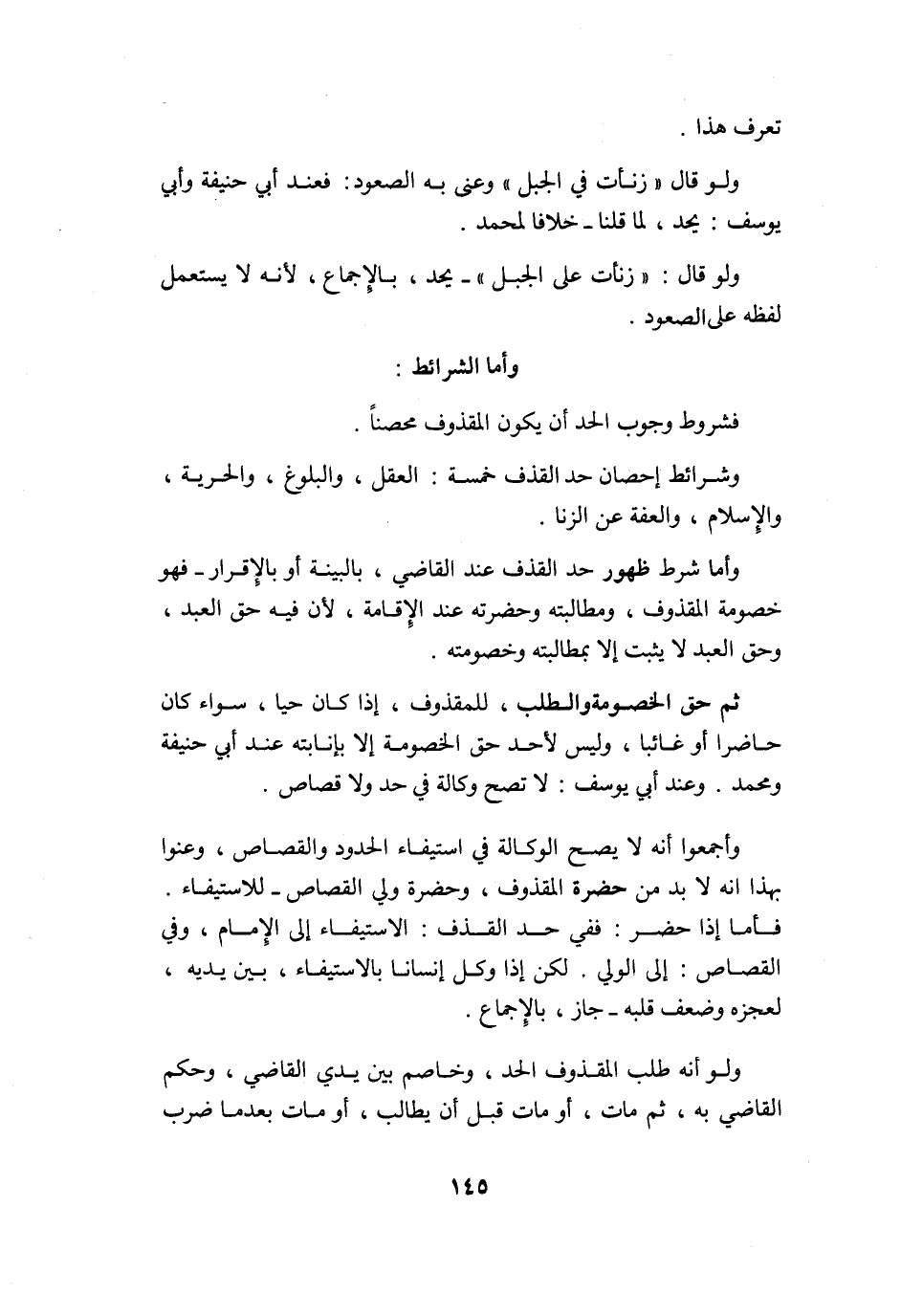وَأما شَرط ظُهُور حد الْقَذْف عِنْد القَاضِي بِالْبَيِّنَةِ أَو بِالْإِقْرَارِ فَهُوَ خُصُومَة الْمَقْذُوف ومطالبته وحضرته عِنْد الْإِقَامَة لِأَن فِيهِ حق العَبْد وَحقّ العَبْد لَا يثبت إِلَّا بمطاليته وخصومته