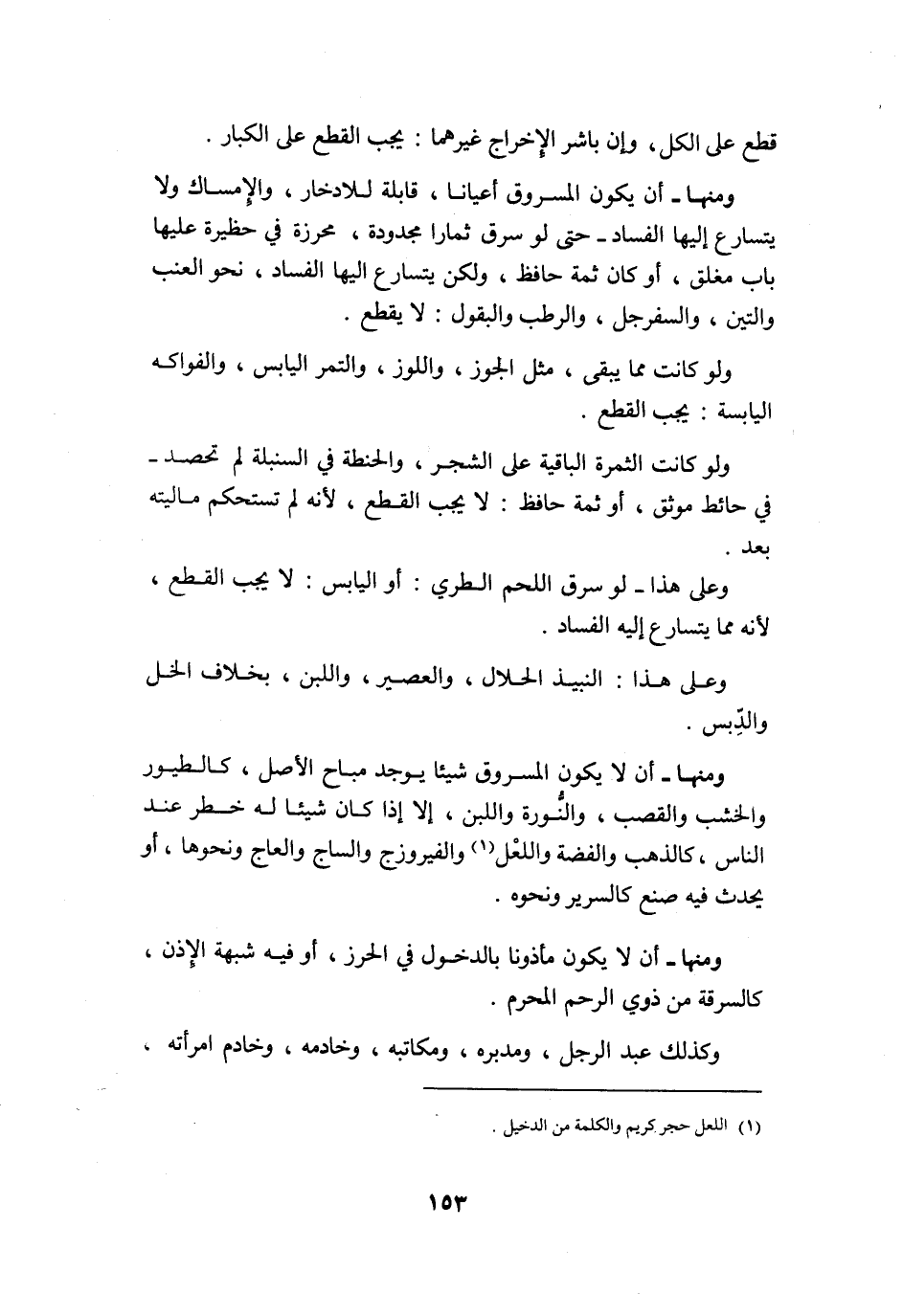 وَمِنْهَا أَن يكون الْمَسْرُوق أعيانا قَابِلَة للإدخار والإمساك وَلَا يتسارع إِلَيْهَا الْفساد حَتَّى لَو سرق ثمارا مجدودة محرزة فِي حَظِيرَة عَلَيْهَا بَاب مغلق أَو كَانَ ثمَّة حَافظ وَلَكِن يتسارع إِلَيْهَا الْفساد نَحْو الْعِنَب والتين والسفرجل وَالرّطب والبقول لَا يقطع