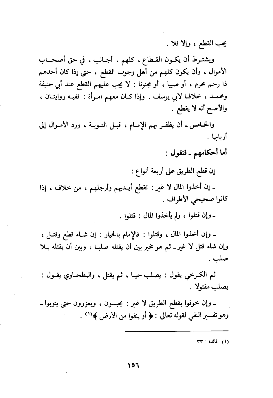 أما أحكامهم فَنَقُول إِن قطع الطَّرِيق على أَرْبَعَة أَنْوَاع إِن أخذُوا المَال لَا غير تقطع أَيْديهم وأرجلهم من خلاف إِذا كَانُوا صحيحي الْأَطْرَاف