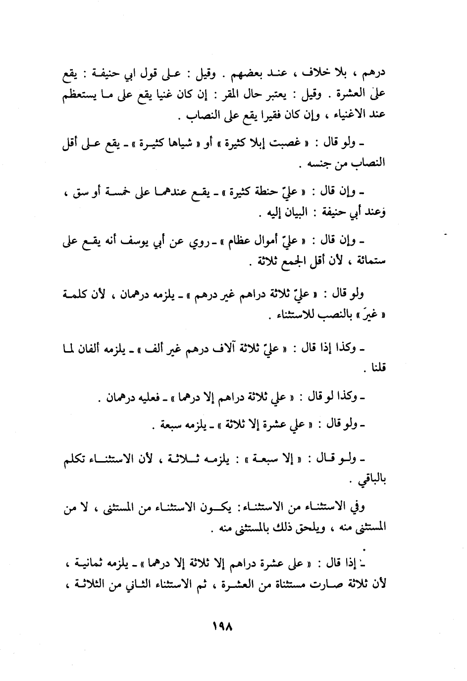 إِذا قَالَ عَليّ عشرَة دَرَاهِم إِلَّا ثَلَاثَة إِلَّا درهما يلْزمه ثَمَانِيَة لِأَن ثَلَاثَة وَصَارَت مُسْتَثْنَاة من الْعشْرَة ثمَّ الِاسْتِثْنَاء الثَّانِي من الثَّلَاثَة