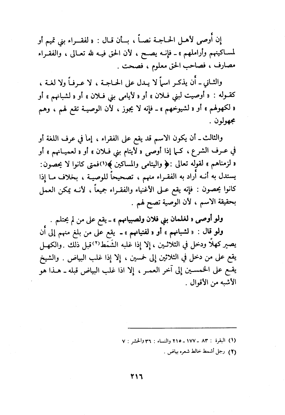 وَالثَّالِث أَن يكون الِاسْم قد يَقع على الْفُقَرَاء إِمَّا فِي عرف اللُّغَة أَو فِي عرف الشَّرْع كَمَا إِذا أوصى لأيتام بني فلَان أَو لعميانهم أَو لزمناهم لقَوْله تَعَالَى {واليتامى وَالْمَسَاكِين} فَمَتَى كَانُوا لَا يُحصونَ يسْتَدلّ بِهِ أَنه أَرَادَ بِهِ الْفُقَرَاء مِنْهُم تَصْحِيحا للْوَصِيَّة بِخِلَاف مَا إِذا كَانُوا يُحصونَ فَإِنَّهُ يَقع على الْأَغْنِيَاء والفقراء جَمِيعًا لِأَنَّهُ يُمكن الْعَمَل بِحَقِيقَة الِاسْم لِأَن الْوَصِيَّة تصح لَهُم
