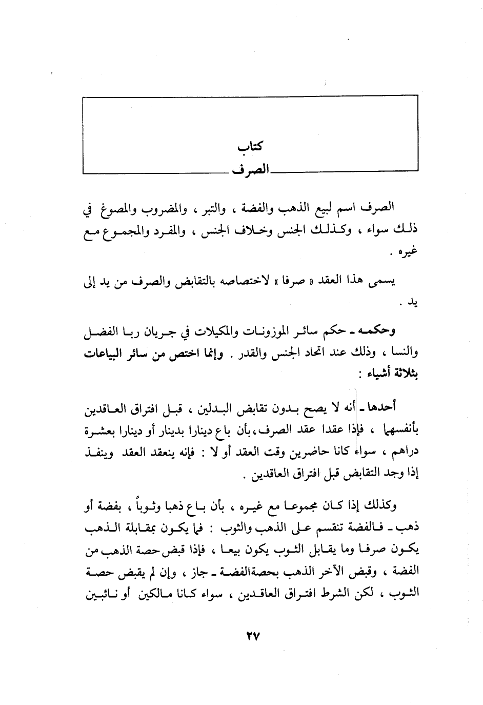 الصّرْف اسْم لبيع الذَّهَب وَالْفِضَّة والتبر والمضروب والمصوغ فِي ذَلِك سَوَاء وَكَذَلِكَ الْجِنْس وَخلاف الْجِنْس والمفرد وَالْمَجْمُوع مَعَ غَيره