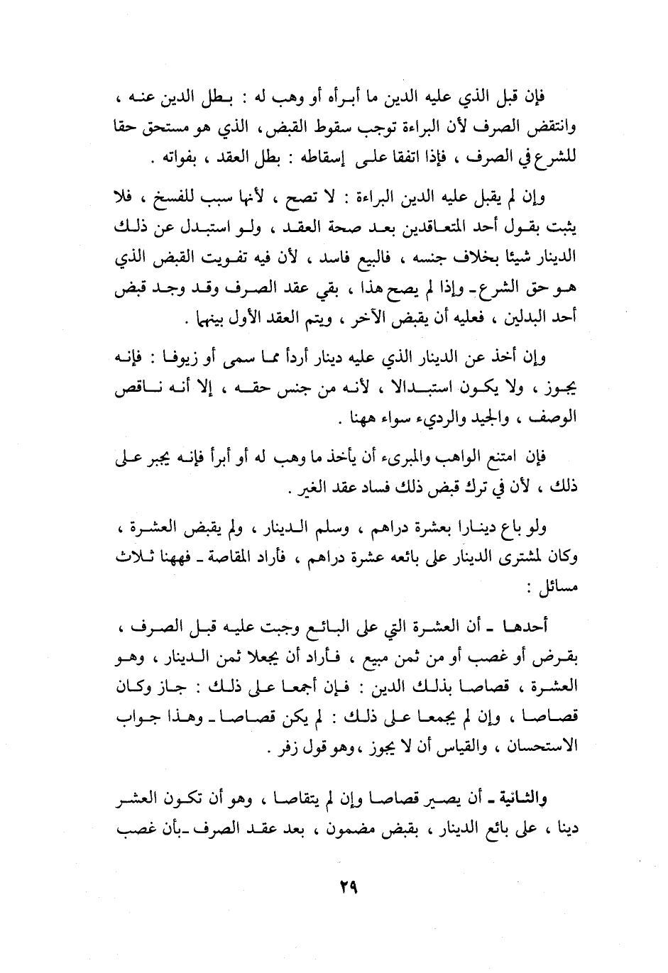 وَلَو بَاعَ دِينَارا بِعشر دَرَاهِم وَسلم الدِّينَار وَلم يقبض الْعشْرَة وَكَانَ لمشتري الدِّينَار على بَائِعه عشرَة دَرَاهِم فَأَرَادَ الْمُقَاصَّة فهاهنا ثَلَاث مسَائِل أَحدهَا أَن الْعشْرَة الَّتِي على البَائِع وَجَبت عَلَيْهِ قبل الصّرْف بقرض أَو غصب أَو من ثمن مَبِيع فَأَرَادَ أَن يجعلا ثمن الدِّينَار وَهُوَ الْعشْرَة قصاصا بذلك الدّين فَإِن أجمعا على ذَلِك جَازَ وَكَانَ قصاصا وَإِن لم يجمعا على ذَلِك لم يكن قصاصا وَهَذَا جَوَاب الِاسْتِحْسَان وَالْقِيَاس أَن لَا يجوز وَهُوَ قَول زفر
