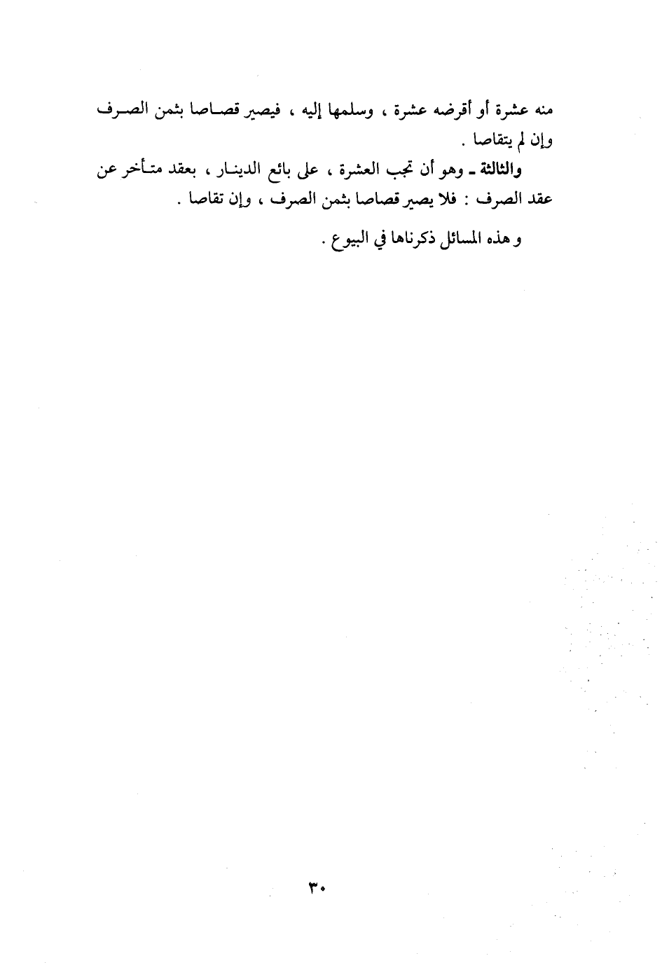 وَالثَّالِثَة وَهُوَ أَن تجب الْعشْرَة على بَائِع الدِّينَار بِعقد مُتَأَخّر عَن عقد الصّرْف فَلَا يصير قصاصا بِثمن الصّرْف وَإِن تقاصا