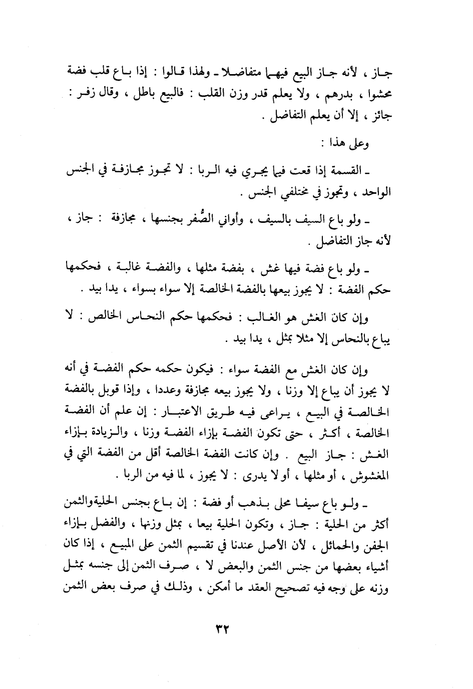 وَلَو بَاعَ سَيْفا محلى بِذَهَب أَو فضَّة إِن بَاعَ بِجِنْس الْحِلْية وَالثمن أَكثر من الْحِلْية جَازَ وَتَكون الْحِلْية بيعا بِمثل وَزنهَا وَالْفضل بِإِزَاءِ الجفن والحمائل لِأَن الأَصْل عندنَا فِي تَقْسِيم الثّمن على الْمَبِيع إِذا كَانَ أَشْيَاء بَعْضهَا من جنس الثّمن وَالْبَعْض لَا صرف الثّمن إِلَى جنسه بِمثل وَجه فِيهِ تَصْحِيح العقد مَا أمكن وَذَلِكَ فِي صرف بعض الثّمن