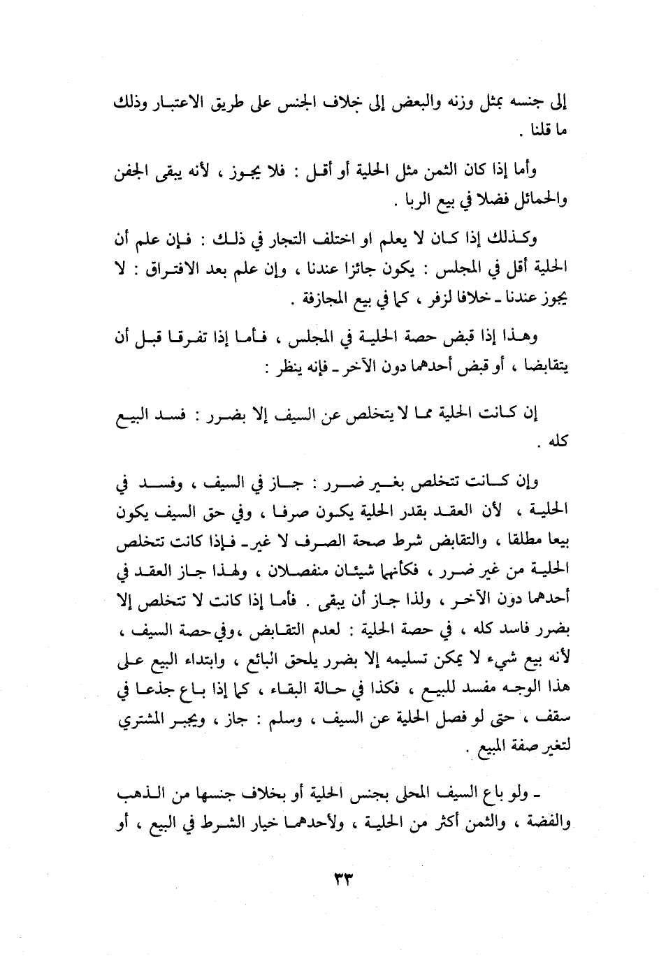 وَهَذَا إِذا قبض حِصَّة الْحِلْية فِي الْمجْلس فَأَما إِذا تفَرقا قبل أَن يتقابضا أَو قبض أَحدهمَا دون الآخر فَإِنَّهُ ينظر إِن كَانَت الْحِلْية مِمَّا لَا يتَخَلَّص عَن السَّيْف إِلَّا بِضَرَر فسد البيع كُله