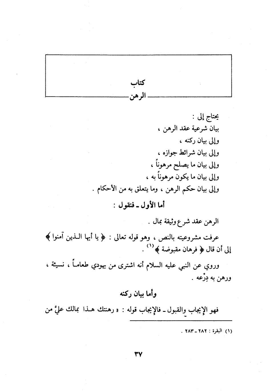 يحْتَاج إِلَى بَيَان شَرْعِيَّة عقد الرَّهْن يحْتَاج إِلَى وَإِلَى بَيَان رُكْنه وَإِلَى بَيَان شَرَائِط جَوَازه وَإِلَى بَيَان مَا يصلح مَرْهُونا وَإِلَى بَيَان مَا يكون مَرْهُونا بِهِ وَإِلَى بَيَان حكم الرَّهْن وَمَا يتَعَلَّق بِهِ من الْأَحْكَام