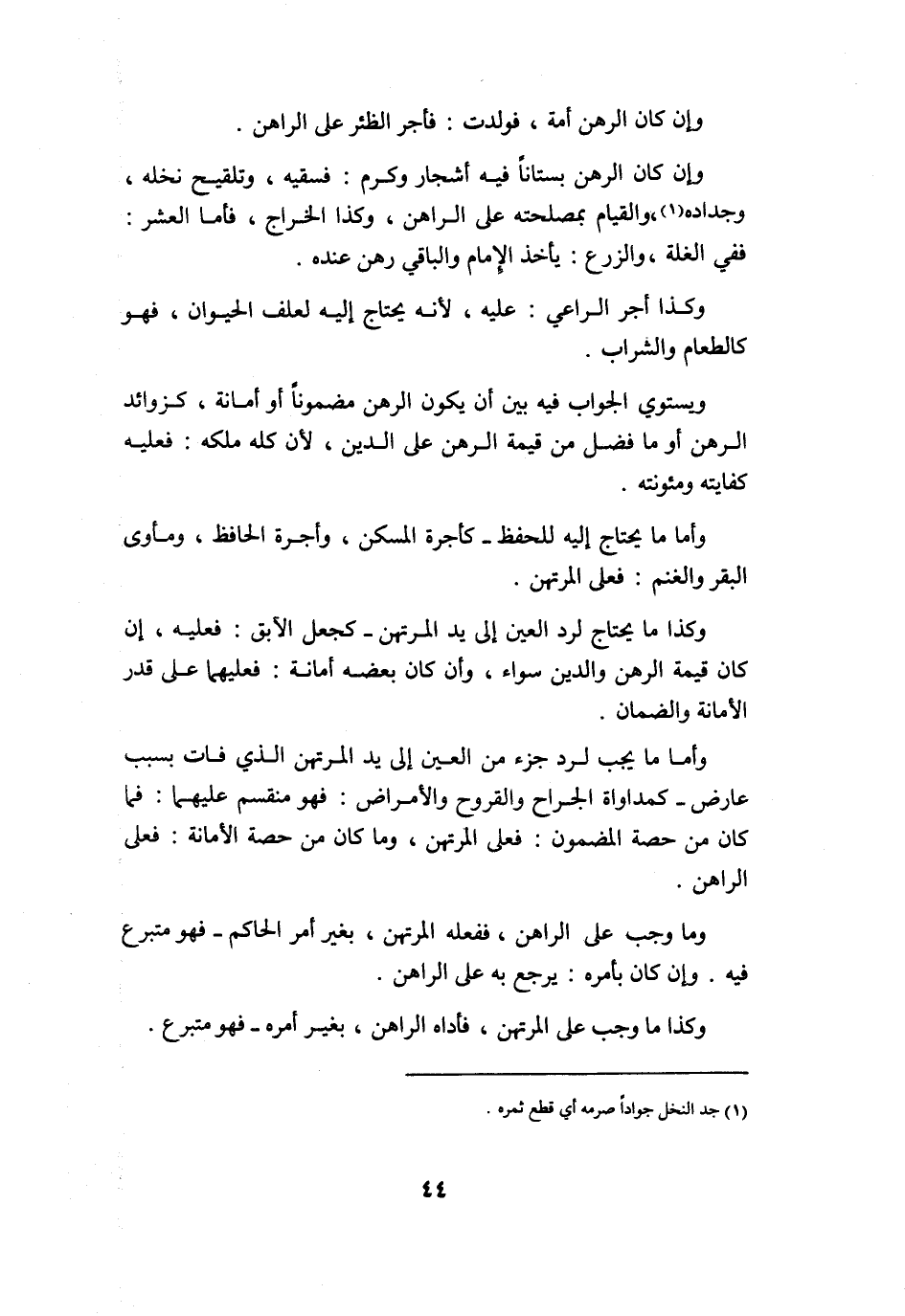 وَإِن كَانَ الرَّهْن بستانا فِيهِ أَشجَار وكرم فسقيه وتلقيح نخله وجداده وَالْقِيَام بمصلحته على الرَّاهِن وَكَذَا الْخراج فَأَما الْعشْر فَفِي الْغلَّة وَالزَّرْع يَأْخُذ الإِمَام وَالْبَاقِي رهن عِنْده