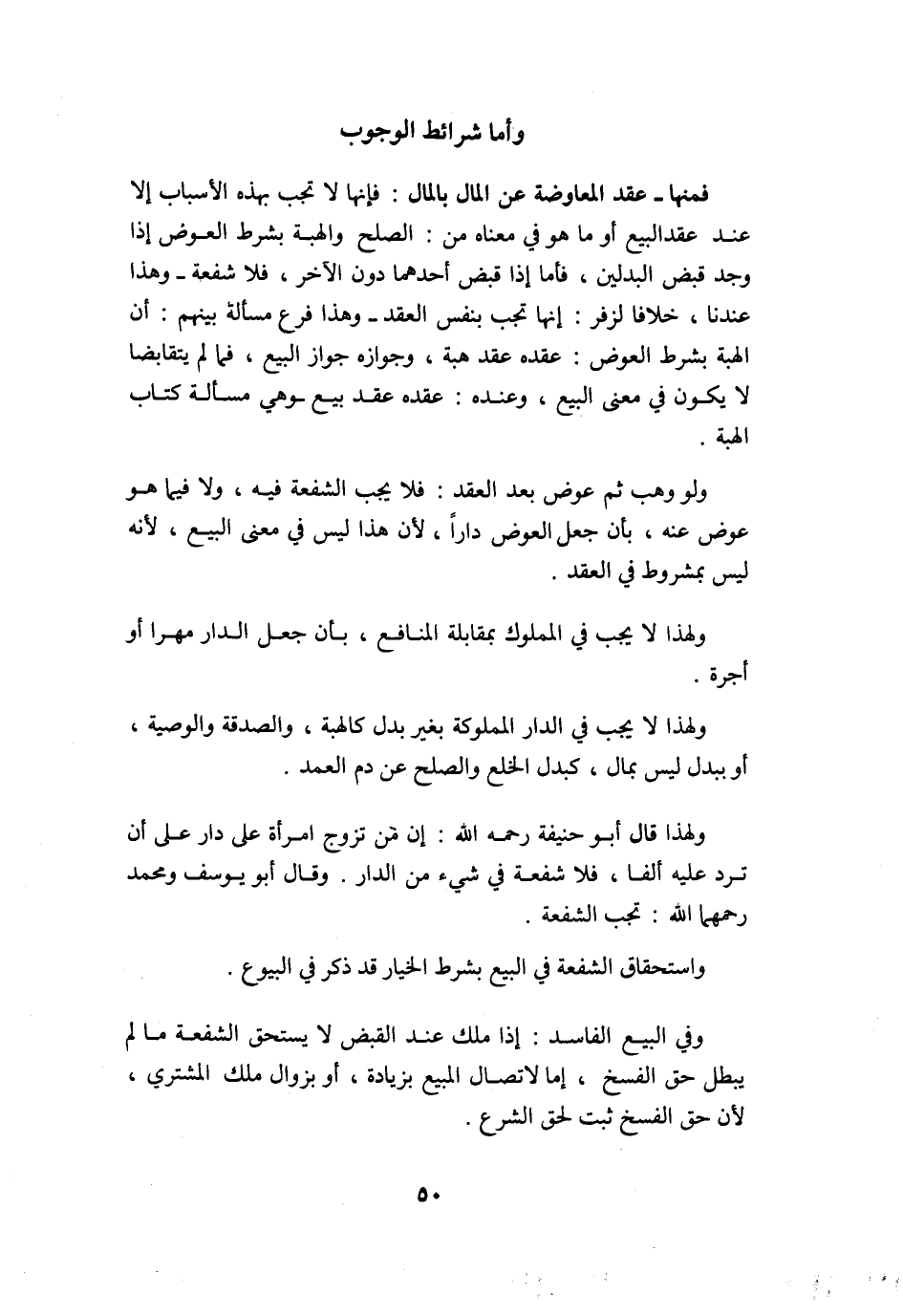 وَأما شَرَائِط الْوُجُوب فَمِنْهَا عقد الْمُعَاوضَة عَن المَال بِالْمَالِ فَإِنَّهَا لَا تجب بِهَذِهِ الْأَسْبَاب إِلَّا عِنْد عقد البيع أَو مَا هُوَ فِي مَعْنَاهُ من الصُّلْح وَالْهِبَة بِشَرْط الْعِوَض إِذا وجد قبض الْبَدَلَيْنِ فَأَما إِذا قبض أَحدهمَا دون الآخر فَلَا شُفْعَة وَهَذَا عندنَا خلافًا ل زفر إِنَّهَا تجب بِنَفس العقد وَهَذَا فرع مَسْأَلَة بَينهم أَن الْهِبَة بِشَرْط الْعِوَض عقده عقد هبة وجوازه جَوَاز البيع فَمَا لم يتقابضا لَا يكون فِي معنى البيع وَعِنْده عقده عقد بيع وَهِي مَسْأَلَة كتاب الْهِبَة