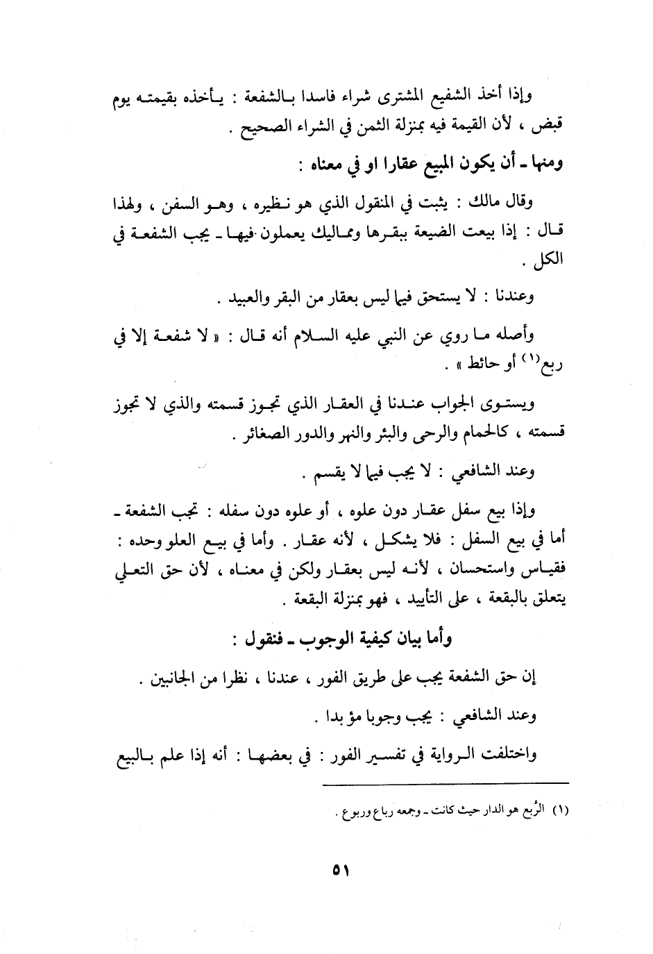 وَأما بَيَان كَيْفيَّة الْوُجُوب فَنَقُول إِن حق الشُّفْعَة يجب على طَرِيق الْفَوْر عندنَا نظرا من الْجَانِبَيْنِ