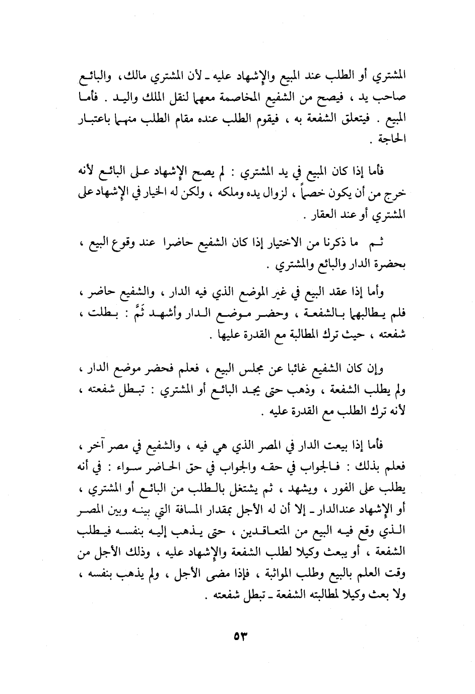 فَأَما إِذا بِيعَتْ الدَّار فِي الْمصر الَّذِي هِيَ فِيهِ وَالشَّفِيع فِي مصر آخر فَعلم بذلك فَالْجَوَاب فِي حَقه وَالْجَوَاب فِي حق الْحَاضِر سَوَاء فِي أَنه يطْلب على الْفَوْر وَيشْهد ثمَّ يشْتَغل بِالطَّلَبِ من البَائِع أَو المُشْتَرِي أَو الْإِشْهَاد عِنْد الدَّار إِلَّا أَن لَهُ الْأَجَل بِمِقْدَار الْمسَافَة الَّتِي بَينه وَبَين الْمصر الَّذِي وَقع فِيهِ البيع من الْمُتَعَاقدين حَتَّى يذهب إِلَيْهِ بِنَفسِهِ فيطلب الشُّفْعَة أَو يبْعَث وَكيلا لطلب الشُّفْعَة وَالْإِشْهَاد عَلَيْهِ وَذَلِكَ الْأَجَل من وَقت الْعلم بِالْبيعِ وَطلب المواثبة فَإِذا مضى الْأَجَل وَلم يذهب بِنَفسِهِ وَلَا بعث وَكيلا لمطالبته الشُّفْعَة تبطل شفعته