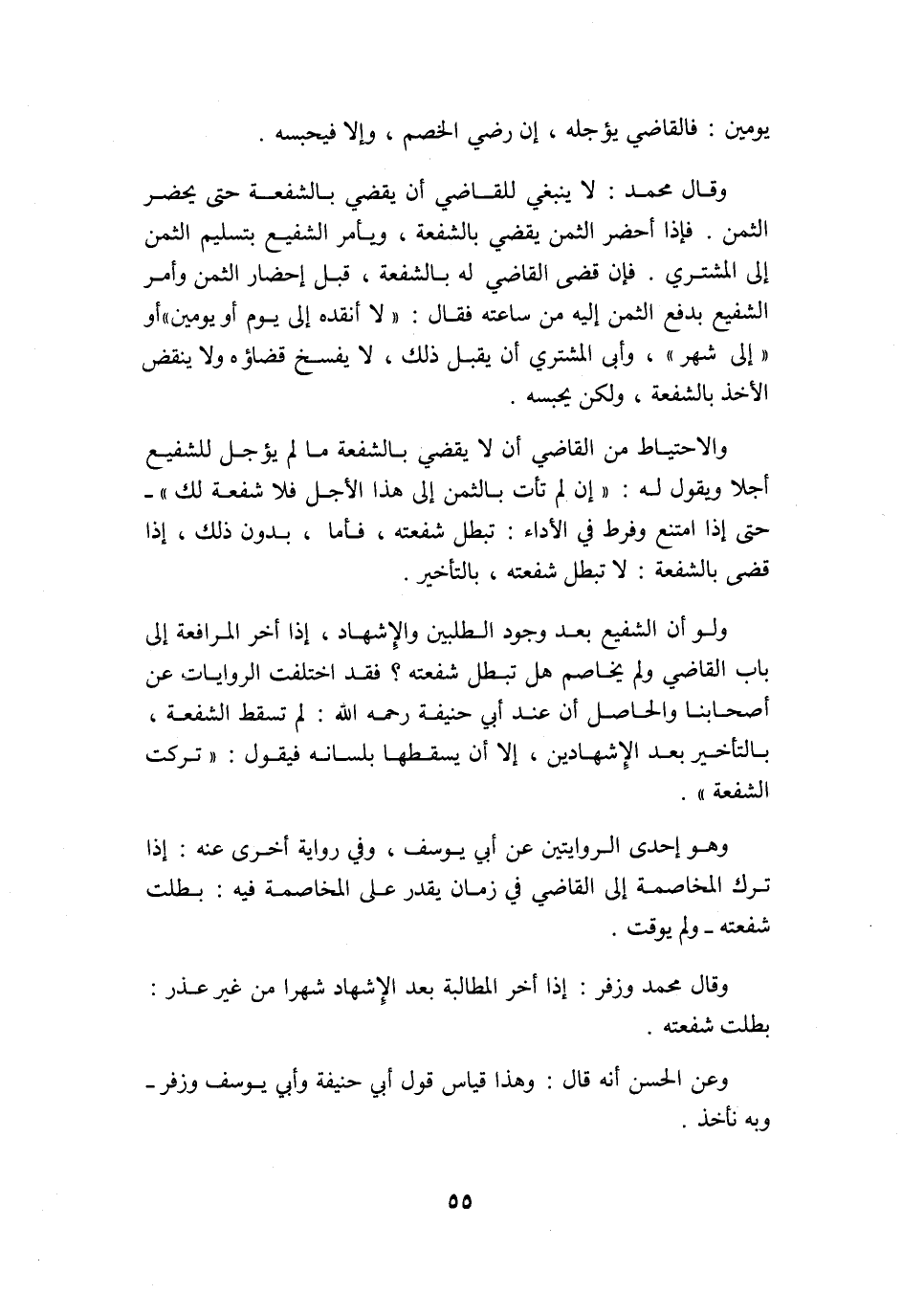 وَهُوَ إِحْدَى الرِّوَايَتَيْنِ عَن أبي يُوسُف وَفِي رِوَايَة أُخْرَى عَنهُ إِذا ترك الْمُخَاصمَة إِلَى القَاضِي فِي زمَان يقدر على الْمُخَاصمَة فِيهِ بطلت شفعته وَلم يُوَقت