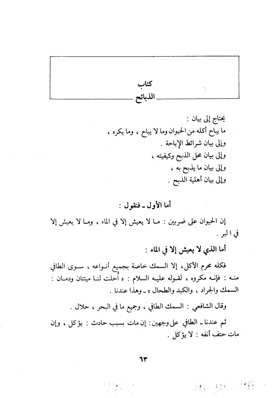 أما الأول فَنَقُول إِن الْحَيَوَان على ضَرْبَيْنِ مَا لَا يعِيش إِلَّا فِي المَاء وَمَا لَا يعِيش إِلَّا فِي الْبر