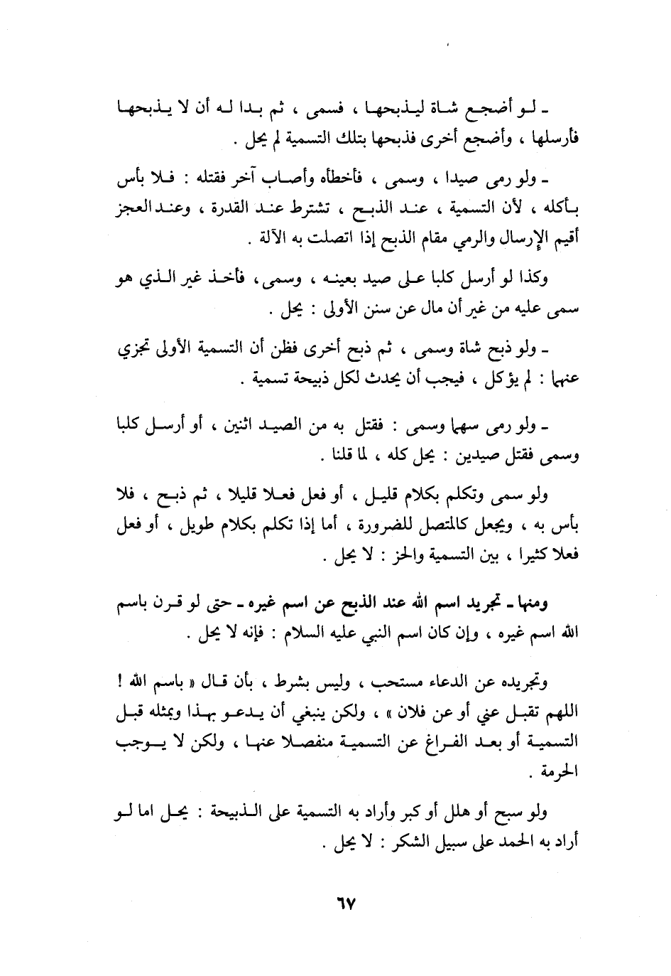 وَمِنْهَا تَجْرِيد اسْم الله عِنْد الذّبْح عَن اسْم غَيره حَتَّى لَو قرن باسم الله اسْم غَيره وَإِن كَانَ اسْم النَّبِي عَلَيْهِ السَّلَام فَإِنَّهُ لَا يحل