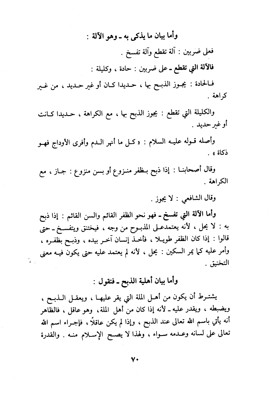 وَأما بَيَان مَا يذكي بِهِ وَهُوَ الْآلَة فعلى ضَرْبَيْنِ آلَة تقطع وَآلَة تفسخ