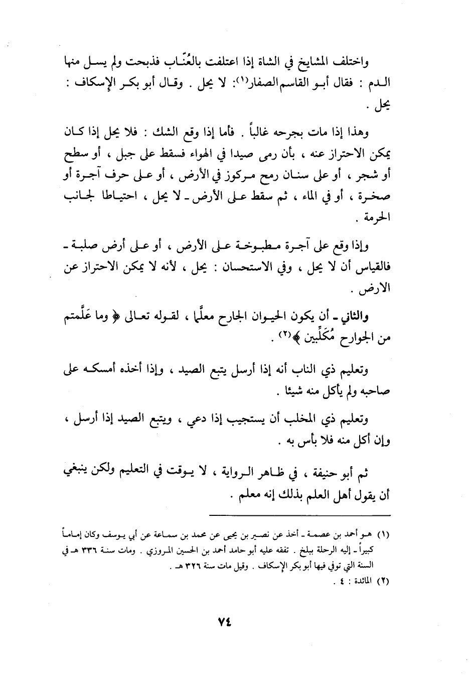 وَاخْتلف الْمَشَايِخ فِي الشَّاة إِذا اعتلفت بالعناب فذبحت وَلم يسل مِنْهَا الدَّم فَقَالَ أَبُو الْقَاسِم الصفار لَا يحل