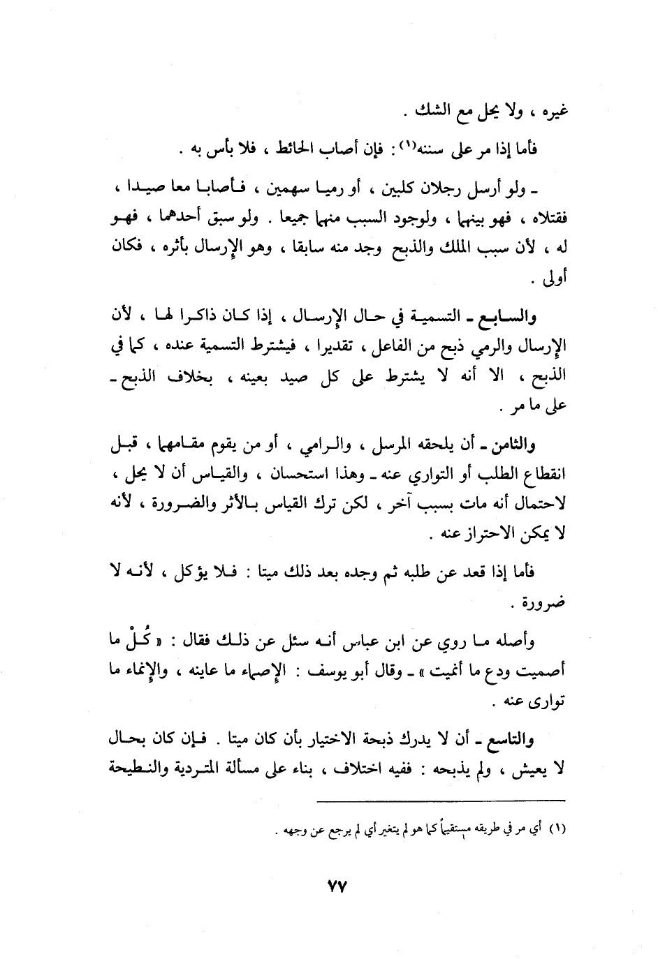 وَالثَّامِن أَن يلْحقهُ الْمُرْسل والرامي أَو من يقوم مقامهما قبل انْقِطَاع الطّلب أَو التواري عَنهُ وَهَذَا اسْتِحْسَان وَالْقِيَاس أَن لَا يحل لاحْتِمَال أَنه مَاتَ بِسَبَب آخر لَكِن ترك الْقيَاس بالأثر والضرورة لِأَنَّهُ لَا يُمكن الِاحْتِرَاز عَنهُ