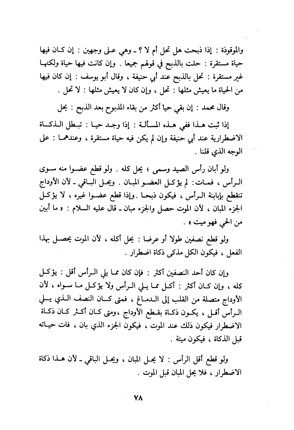 والموقوذة إِذا ذبحت هَل تحل أم لَا وَهِي على وَجْهَيْن إِن كَانَ فِيهَا حَيَاة مُسْتَقِرَّة حلت بِالذبْحِ فِي قَوْلهم جَمِيعًا