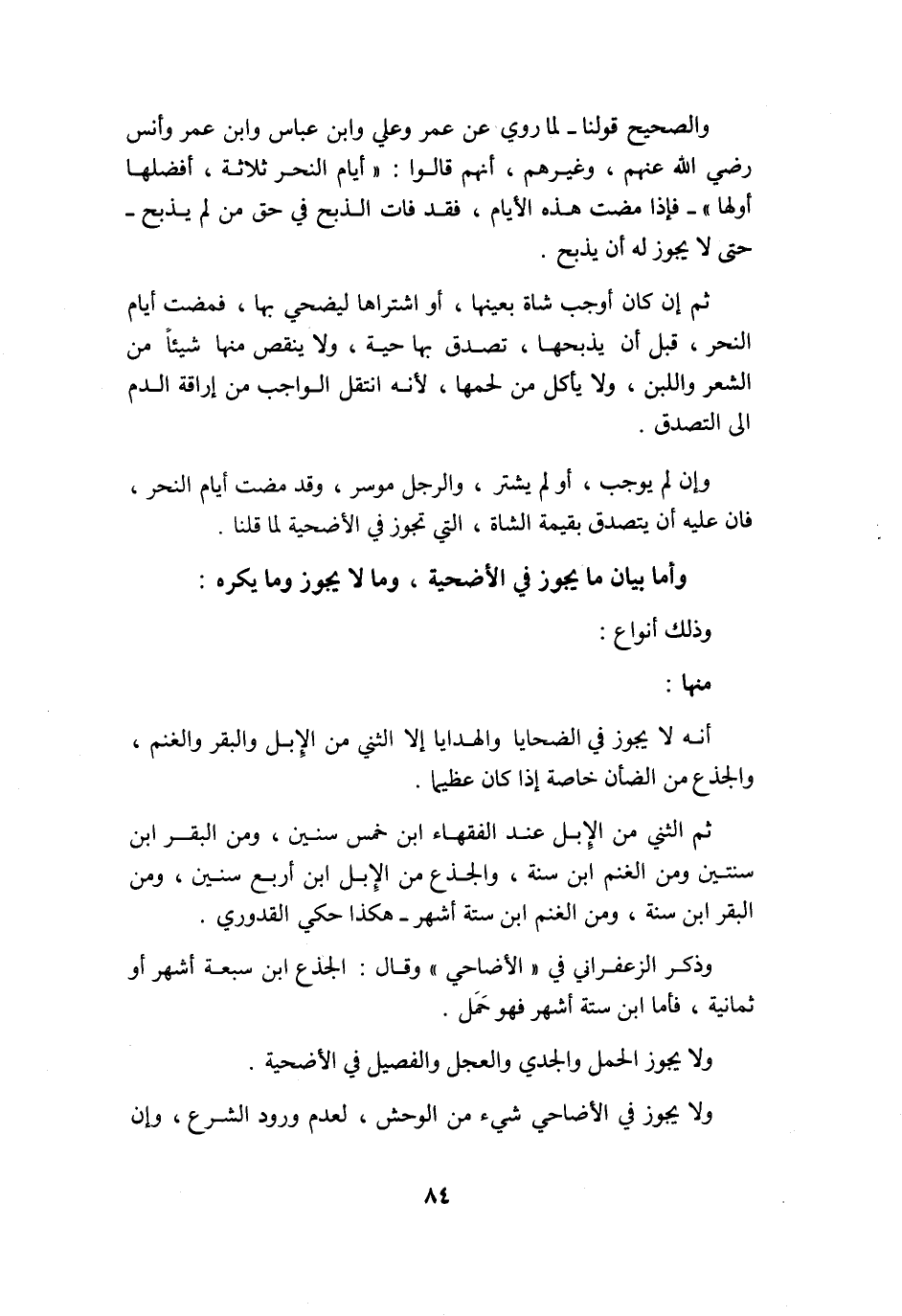 وَأما بَيَان مَا يجوز فِي الْأُضْحِية وَمَا لَا يجوز وَمَا يكره وَذَلِكَ أَنْوَاع مِنْهَا أَنه لَا يجوز فِي الضَّحَايَا والهدايا إِلَّا الثني من الْإِبِل الْبَقر وَالْغنم والجذع من الضَّأْن خَاصَّة إِذا كَانَ عَظِيما