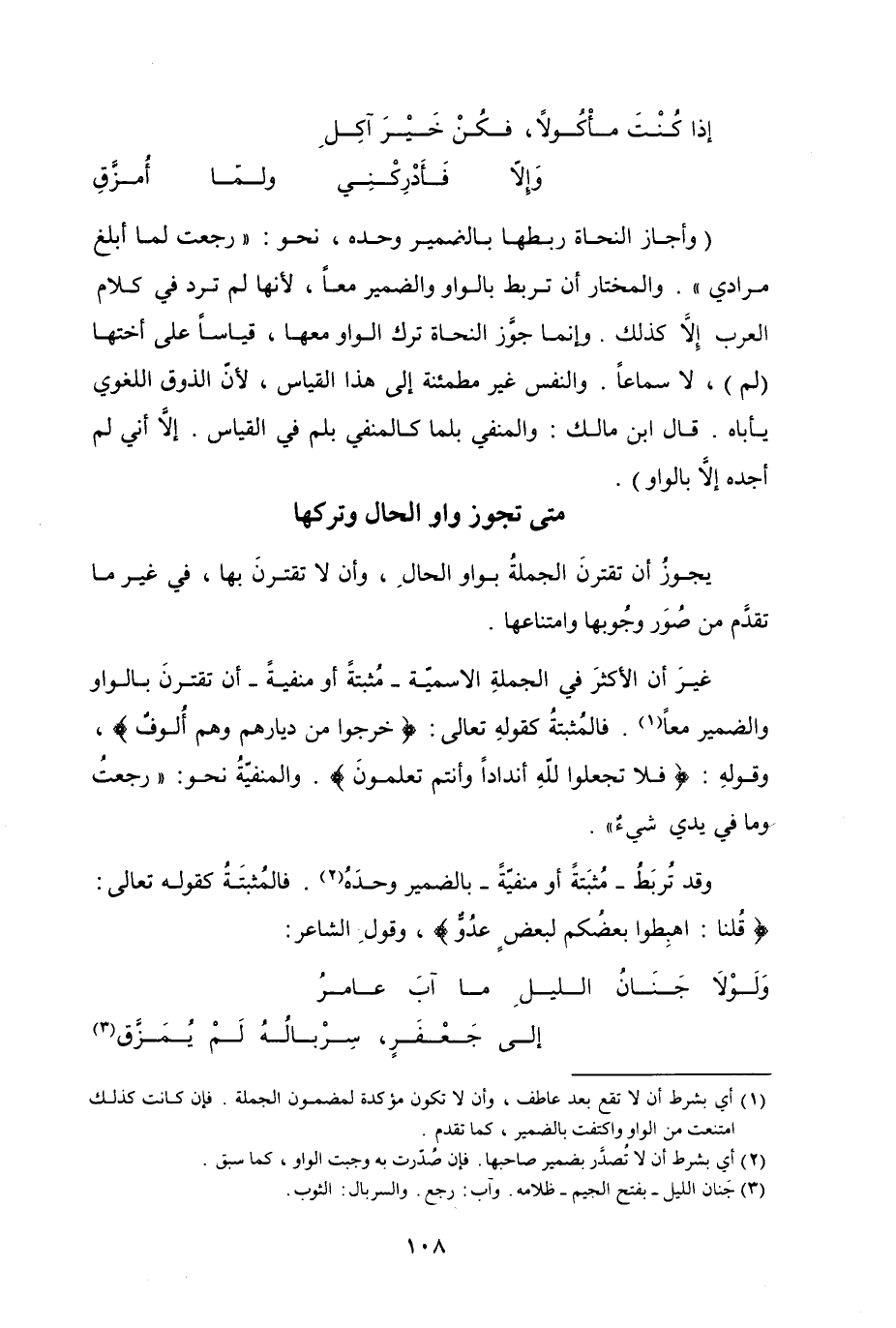 (وأجاز النحاة ربطها بالضمير وحده، نحو "رجعت لما أبلغ مرادي". والمختار أن تربط بالواو والضمير معاً، لأنها لم ترد في كلام العرب إلا كذلك. وإنما جوَّز النحاة ترك الواو معها، قياساً على أختها (لم) ، لا سماعاً. والنفس غير مطمئنة إلى هذا القياس، لأنّ الذوق اللغوي يأباه. قال ابن مالك والمنفي بلما كالمنفي بلم في القياس. إلا أني لم أجده إلا بالواو) .