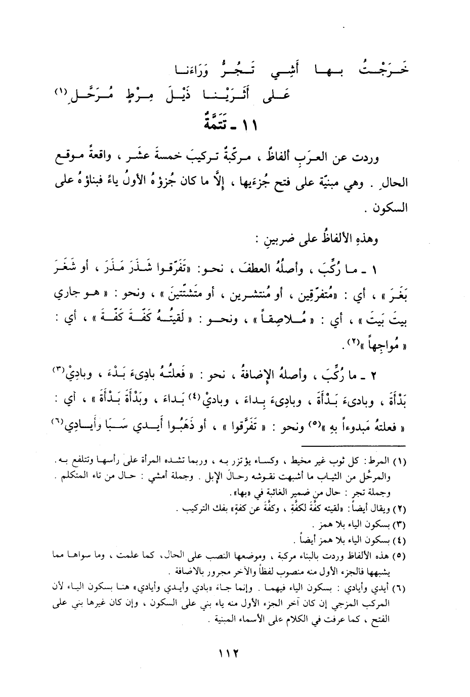 2- ما رُكِّبَ، وأصلهُ الإضافةُ، نحو "فَعلتُهُ بادِئَ بَدْءَ، وبادِيْ بَدْأَةَ، وبادِئَ بِداءَ، وباديْ بَداءَ، وبَدْأَةَ بَدْأَةَ"، أي "فعلتُهُ مَبدوءاً بهِ" ونحو "تفَرَّقوا، أو ذَهَبُوا أَيدي سَبَا وأَيادِي