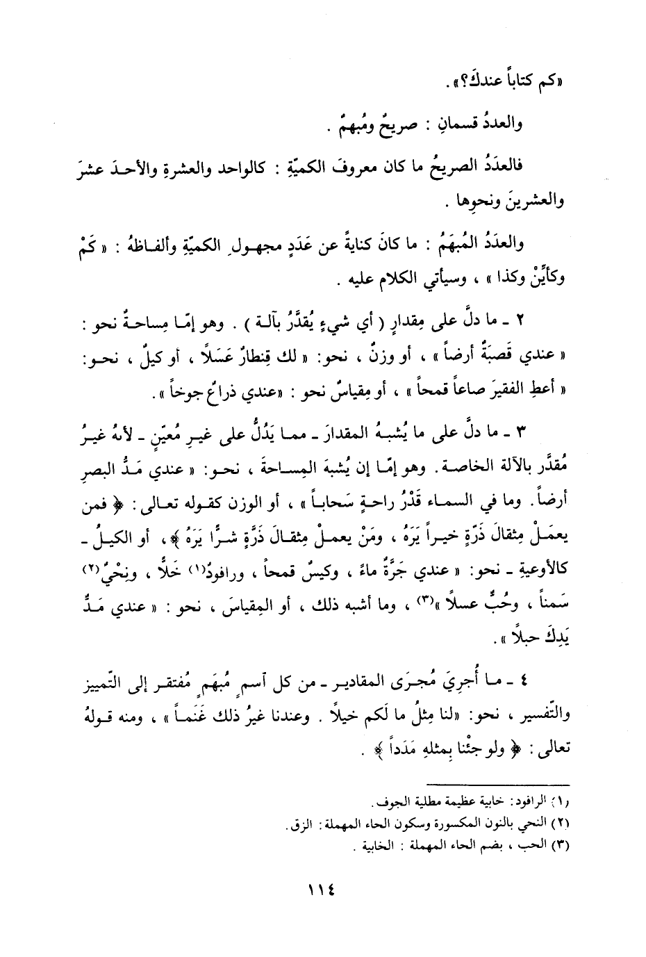 3- ما دلَّ على ما يُشبهُ المقدارَ - مما يَدُلُّ على غيرِ مُعيّنٍ - لأنهُ غيرُ مُقدَّر بالآلة الخاصّة. وهو إمّا إن يُشبهَ المِساحةَ، نحو "عندي مَدُّ البصرِ أرضاً. وما في السماء قَدْرُ راحةٍ سَحاباً"، أو الوزن كقوله تعالى {فمن يعمَلْ مِثقالَ ذَرَّةٍ خيراً يَرَهُ، ومَنْ يعملْ مِثقالَ ذَرَّةٍ شرًّا يَرَهُ} ، أو الكيلُ - كالأوعيةِ - نحو "عندي جَرَّةٌ ماءً، وكيسٌ قمحاً، وراقودٌ خَلاًّ، ونِحْيٌ سَمناً، وحُبٌّ عسلاً"، وما أشبه ذلك، أو المِقياسَ، نحو "عندي مَدُّ يَدِكَ حبلاً".