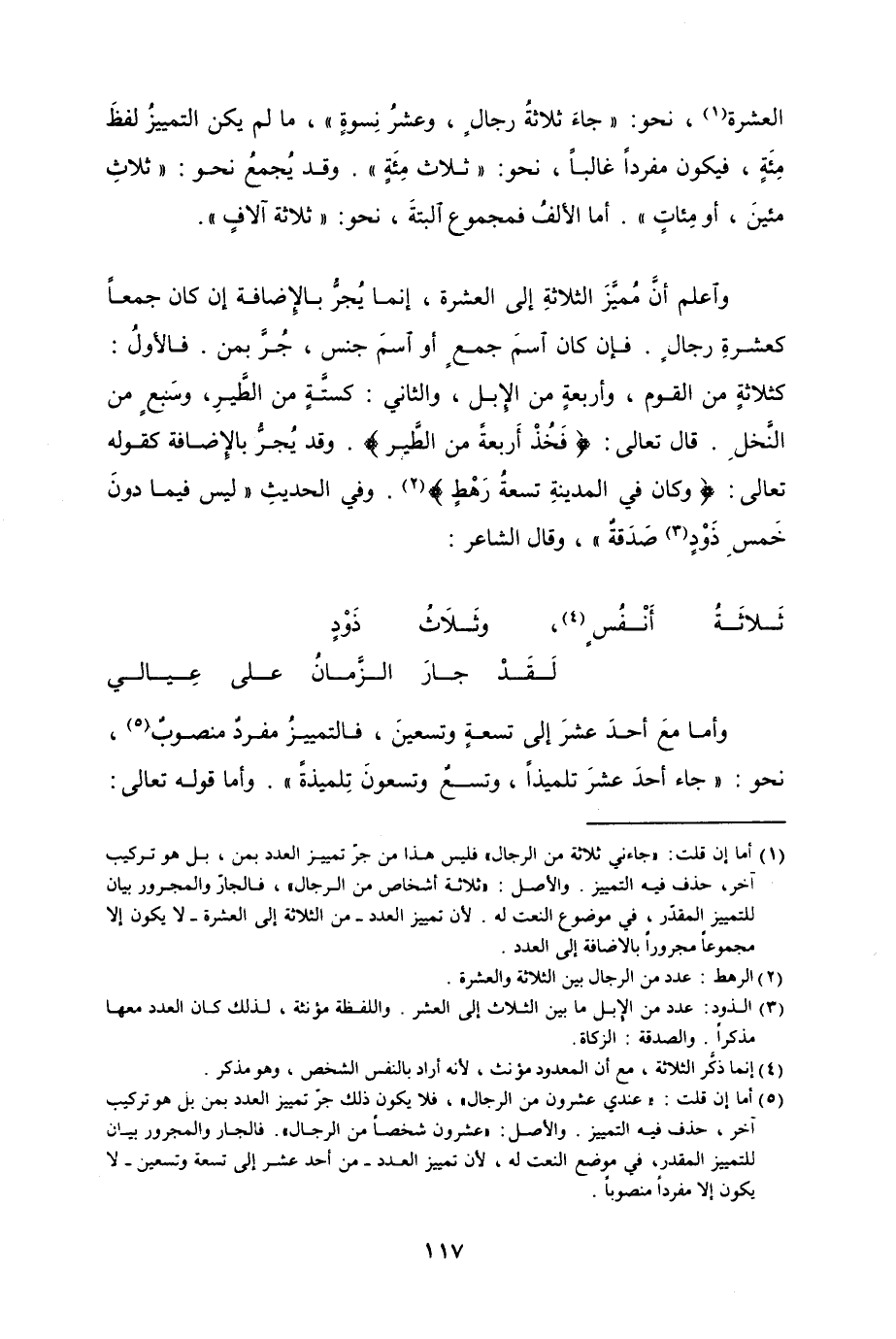 واعلم أنَّ مُميَّزَ الثلاثةِ إلى العشرة، إنما يُجرُّ بالإضافة إن كان جمعاً كعشرةِ رجالٍ. فإن كان اسمَ جمعٍ أو اسمَ جنس، جُرَّ بمن. فالأولُ كثلاثةٍ من القوم، وأَربعةٍ من الإبل، والثاني كستَّةٍ من الطَّيرِ، وسَبعٍ من النَّخلِ. قال تعالى {فَخُذْ أَربعةً من الطَّير} . وقد يُجرُّ بالإضافة كقوله تعالى {وكان في المدينةِ تسعةُ رَهْطٍ} . وفي الحديثِ "ليس فيما دونَ خَمسٍ ذَوْدٍ صَدَقةٌ"، وقال الشاعر [من الوافر]