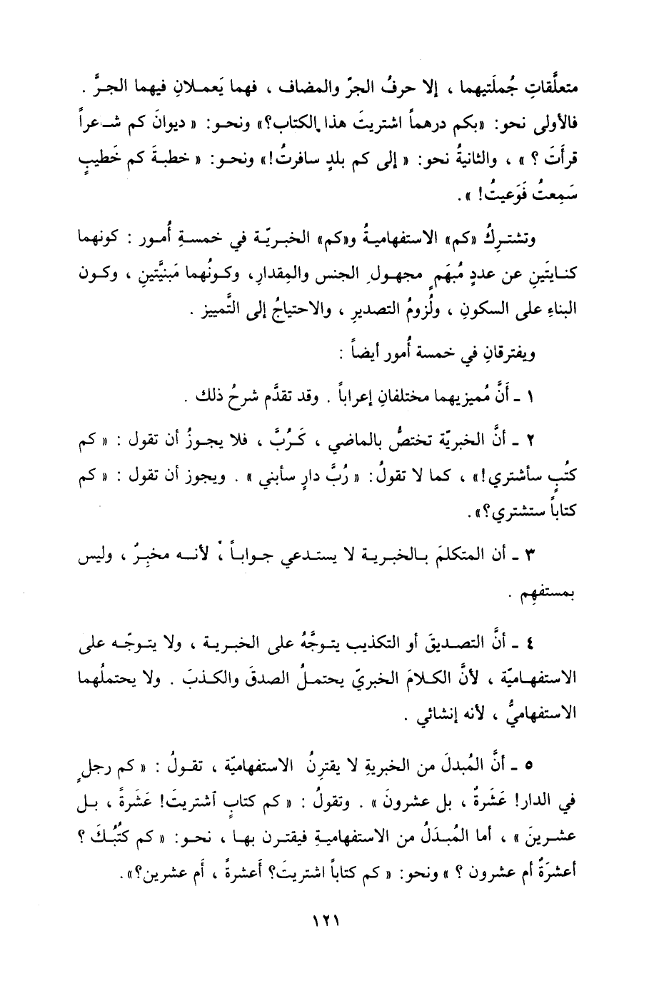 وتشترِكُ "كم" الاستفهاميةُ و"كم" الخبريّة في خمسةِ أمور كونُهما كنايتَينِ عن عددٍ مُبهَمٍ مجهولِ الجنس والمِقدارِ، وكونُهما مُبنيَّتينِ، وكون النباءِ على السكونِ، ولُزومُ التصديرِ، والاحتياجُ إلى التَّمييز.