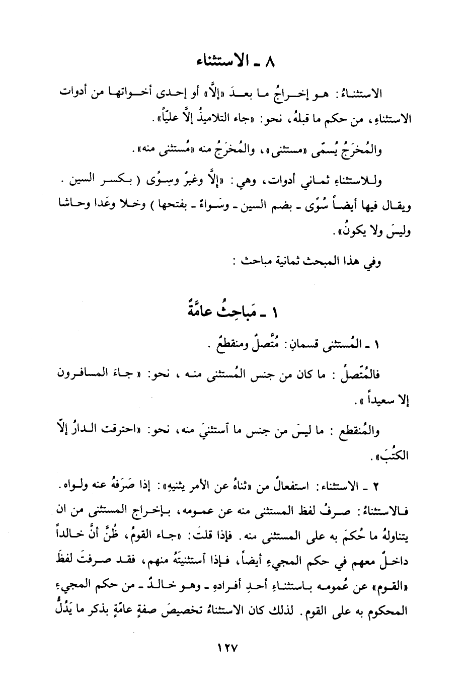 1- المُستثنى قسمانِ مُتَّصلٌ ومنقطعٌ.
