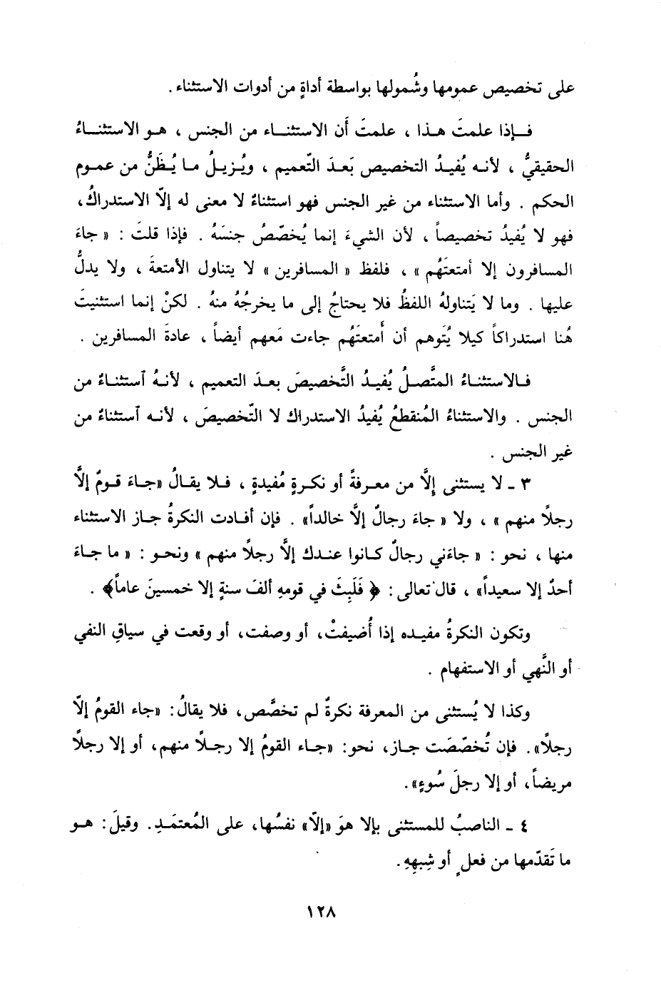 وكذا لا يُستثنى من المعرفة نكرةٌ لم تخصَّص، فلا يقالُ "جاء القومُ إلاّ رجلاً". فإن تُخصّصَت جاز، نحو "جاء القومُ إلاّ رجلاً منهم، أو إلاَّ رجلاً مريضاً، أو إلاّ رجلَ سُوءٍ".