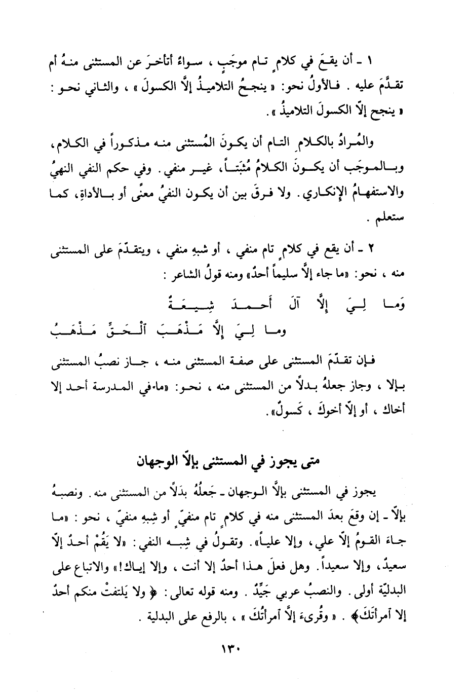 يجوز في المستثنى بإلاّ الوجهان - جَعلُهُ بَدَلاً من المستثنى منه. ونصبُهُ بالاّ - إن وقعَ بعدَ المستثنى منه في كلامٍ تام منفيٍّ أو شِبهِ منفيّ، نحو "ما جاءَ القومُ إلاّ علي، وإلا علياً". وتقولُ في شِبه النفي "لا يَقمْ أحدٌ إلاّ سعيدٌ، وإلا سعيداً. وهل فعلَ هذا أحدٌ إلا أنت، وإلا إياك! " والاتباع على البدليّة أولى. والنصبُ عربي جَيِّدٌ. ومنه قوله تعالى {ولا يَلتفتْ منكم أحدٌ إلا امرأتَكَ} . "وقُرئَ إلا امرأتُكَ"، بالرفع على البدلية.