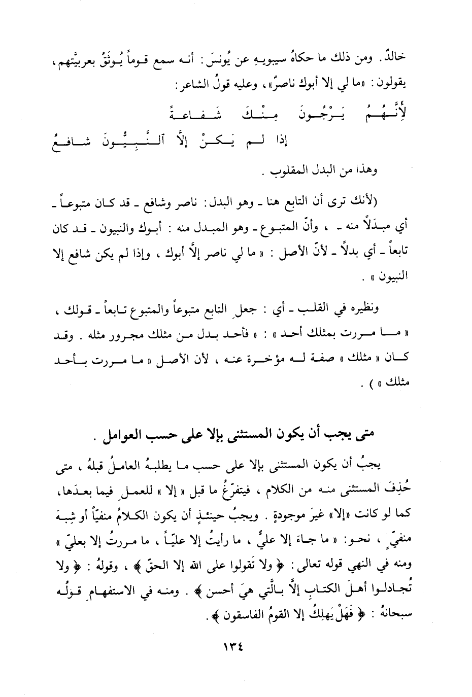 خالدٌ. ومن ذلك ما حكاهُ سيبويهِ عن يُونسَ أنه سمع قوماً يُوثَقُ بِعربيَّتهم، يقولون "ما لي إلا أبوك ناصرٌ"، وعليه قولُ الشاعر [من الطويل]
