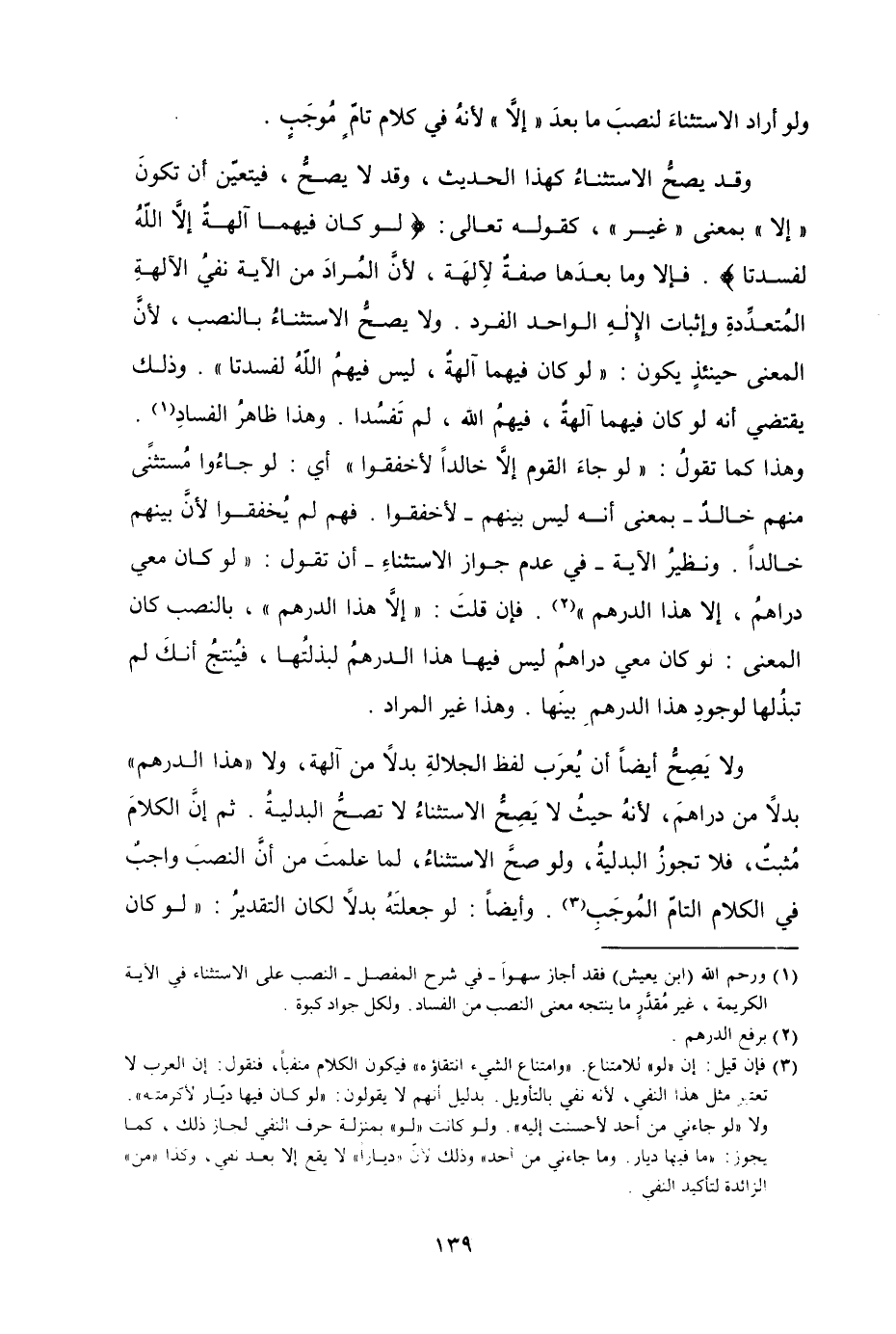 ولا يَصِحُّ أيضاً أن يُعرَب لفظ الجلالةِ بدلاً من آلهة، ولا "هذا الدرهم"، بدلاً من دراهمَ، لأنهُ حيثُ لا يَصِحُّ الاستثناءُ لا تصحُّ البدليّةُ. ثم إنَّ الكلامَ مُثبتٌ، فلا تجوزُ البدليّةُ ولو صحَّ الاستثناءُ، لما علمتَ من أنَّ النصبَ واجبٌ في الكلام التامّ المُوجَبِ. وأيضاً لو جعلتَهُ بدلاً لكان التقديرُ "لو كان
