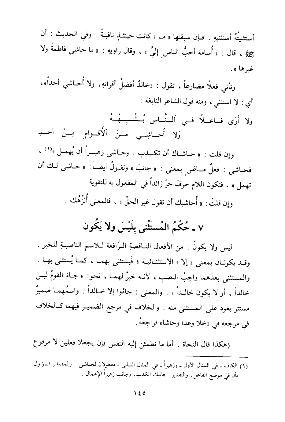 ليس ولا يكونُ من الأفعال الناقصةِ الرَّافعة للاسم الناصبةِ للخبر. وقد يكونان بمعنى "إلا" الاستثنائية؛ فَيستثنى بهما، كما يُستثنى بها. والمستثنى بعدَهما واجبُ النصبِ، لأنه خبرٌ لهما، نحو "جاءَ القومُ ليس خالداً، أو لا يكون خالداً". والمعنى جاءُوا إلا خالداً. واسمُهما ضميرٌ مستتر يعود على المستثنى منه. والخلاف في مرجع الضمير فيهما كالخلاف في مرجعه في "خلا وعدا وحاشا" فراجِعهُ.