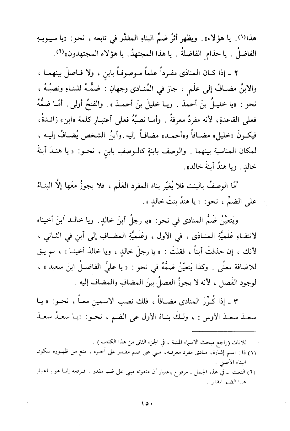 ويتَعيَّنُ ضَمُّ المنادى في نحو "يا رجلُ ابنَ خالدٍ. ويا خالد ابنَ أَخينا" لانتفاءِ عَلَميَّةِ المنادَى، في الأول، وعَلَميَّةِ المضافِ إلى ابنِ في الثاني، لأنك، إن حذفتَ ابناً، فقلتَ "يا رجلَ خالدٍ، ويا خالدَ أخينا"، لم يبق للاضافة معنًى. وكذا يَتعيّنُ ضمُّهُ في نحو "يا عليٌّ الفاضلُ ابنَ سعيد"، لوجود الفَصل، لأنه لا يجوزُ الفصلُ بينَ المضافِ والمضاف إليه.