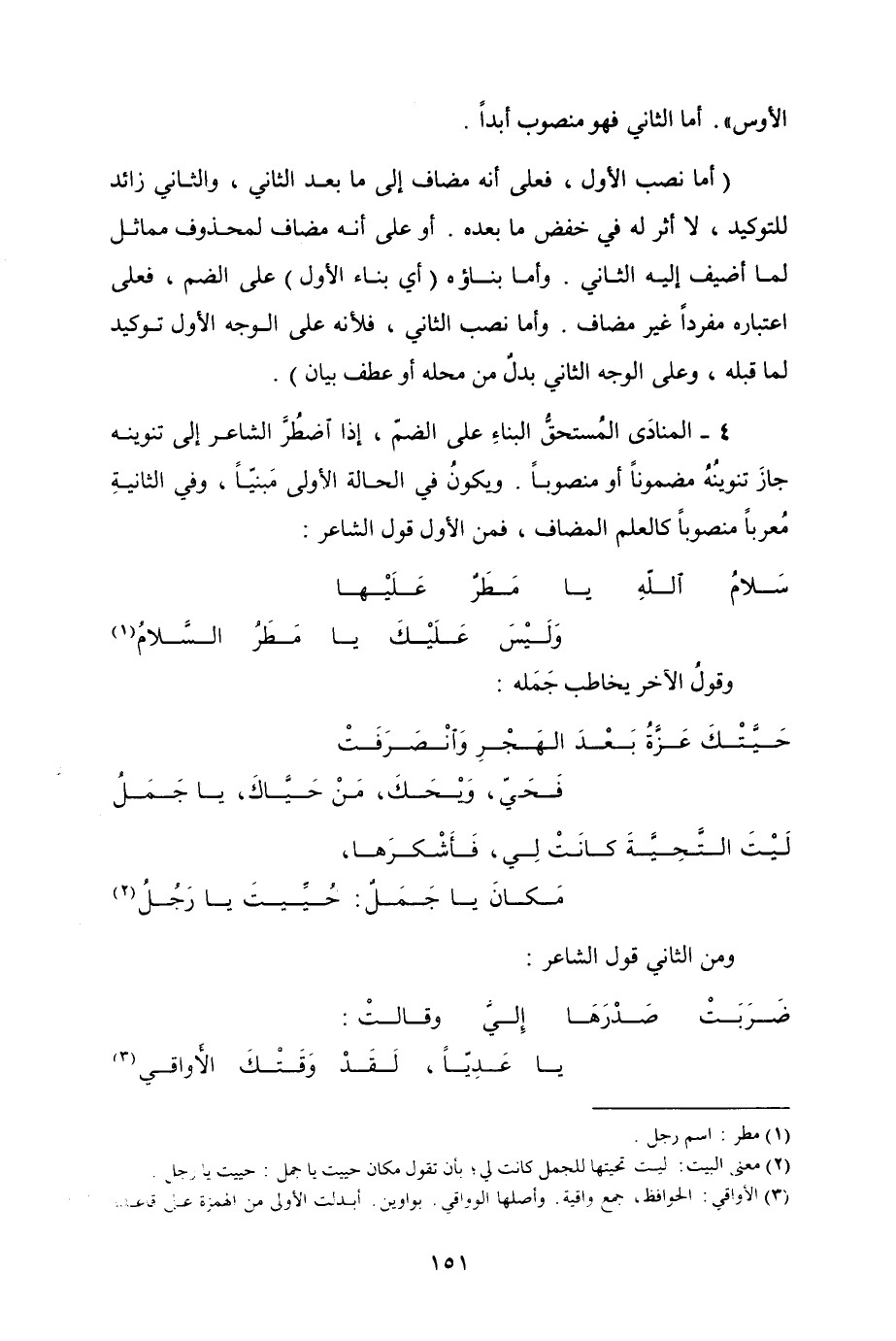 4- المنادَى المُستحقُّ البناءِ على الضمّ، إذا اضطُرَّ الشاعر إلى تنوينه جازَ تنوينُهُ مضموناً أو منصوباً. ويكونُ في الحالة الأولى مَبنيّاً، وفي الثانيةِ مُعرباً منصوباً كالعلم المضاف، فمن الأول قول الشاعر [من الوافر]
