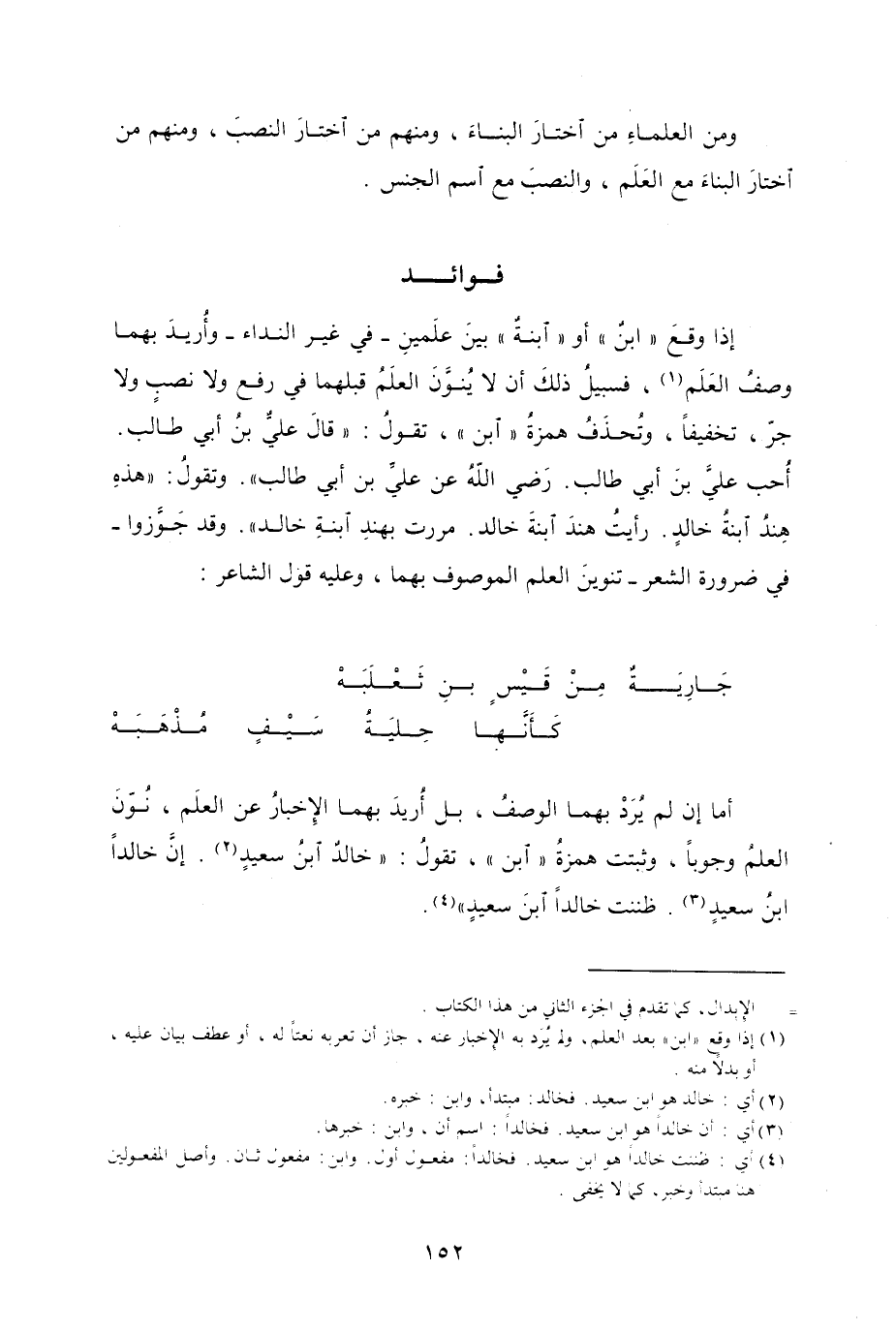 أما إن لم يُرَدْ بهما الوصفُ، بل أُريدَ بهما الإخبارُ عن العلَم، نُوّنَ العلمُ وجوباً، وثبتت همزةُ "ابن"، تقولُ "خالدٌ ابنُ سعيدٍ. إنَّ خالداً ابنُ سعيدٍ. ظننت خالداً ابنَ سعيدٍ".