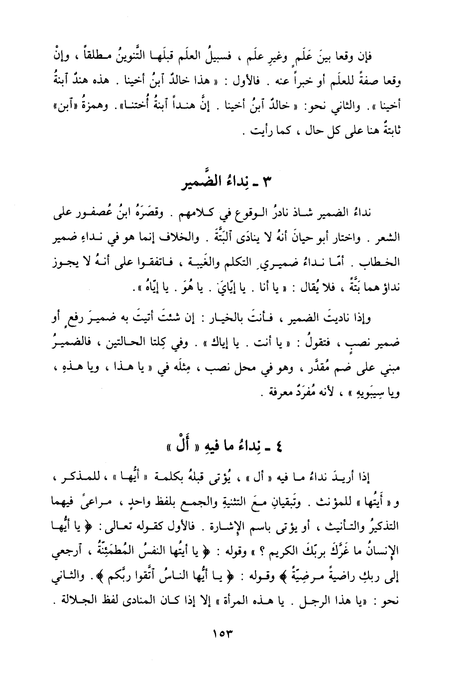 إذا أريْدَ نداءُ ما فيه "أَلْ"، يُؤتى قبلَهُ بكلمةِ "أيُّها" للمذكر، و"أَيّتُها" للمؤنث. وتَبقيانِ معَ التثنيةِ والجمع بلفظ واحدٍ، مراعىً فيهما التذكيرُ والتأنيث، أو يؤتى باسم الإشارة. فالأول كقوله تعالى {يا أيُّها الإنسانُ ما غَرَّكَ بربّكَ الكريم؟} وقوله {يا أيتُها النفسُ المُطمَئِنّةُ، ارجعي إلى ربكِ راضيةً مرضِيّةً} وقوله {يا أيُّها الناسُ اتَّقوا ربَّكم} . والثاني نحو "يا هذا الرجل. يا هذهِ المرأةُ" إلا إذا كان المنادى لفظَ الجلالة.