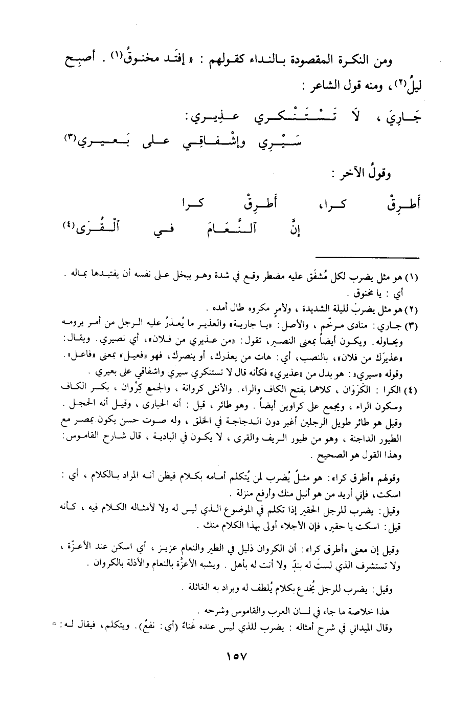 ومن النكرة المقصودة بالنداءِ كقولهم "إفتَد مخنوقُ. أصبح ليلُ ومنه قول الشاعر [من الرجز]