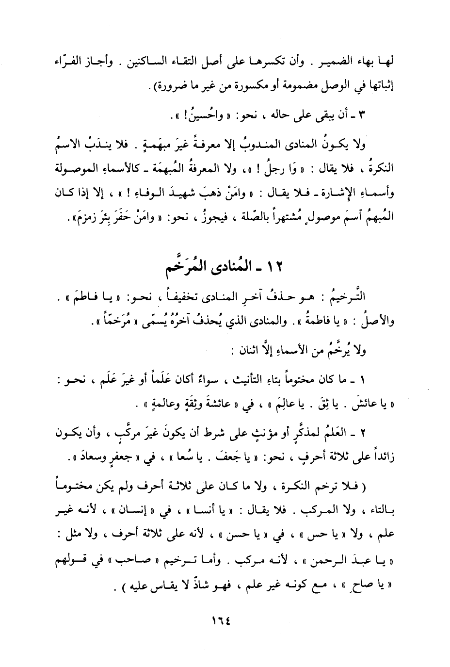 (فلا ترخم النكرة، ولا ما كان على ثلاثة أحرف ولم يكن مختوماً بالتاء، ولا المركب. فلا يقال "يا انسا"، في "انسان"، لأنه غير علم، ولا "يا حسَ"، في "يا حسن"، لأنه على ثلاثة أحرف، ولا مثل "يا عبدَ الرحمن". لأنه مركب. وأما ترخيم "صاحب" في قولهم "يا صاحِ"، مع كونه غير علم، فهو شاذّ لا يقاس عليه) .