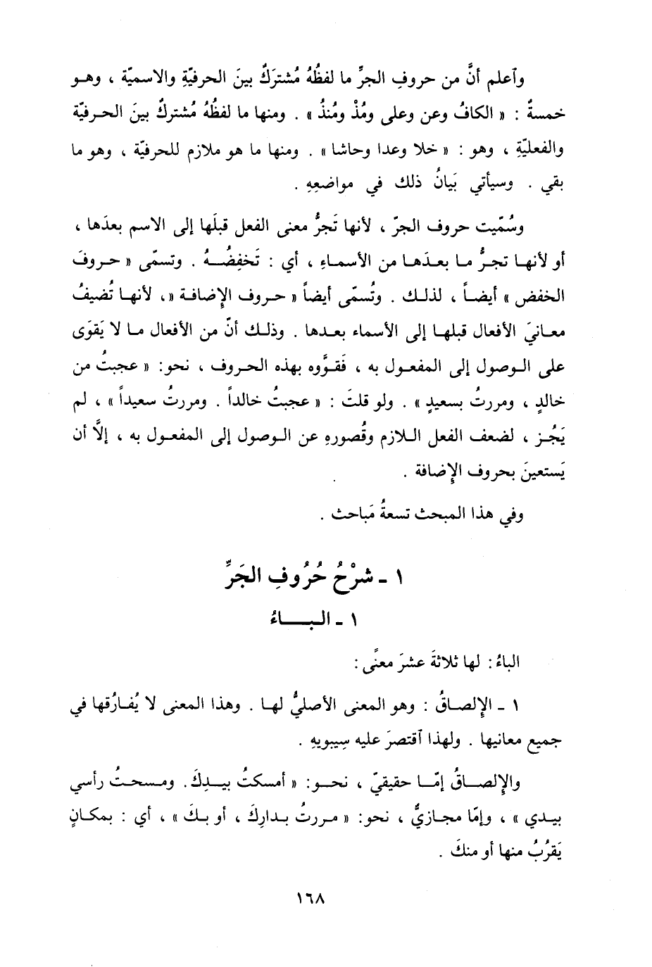 واعلم أنَّ من حروفِ الجرِّ ما لفظُهُ مُشترَكٌ بينَ الحرفيّةِ والاسميّة، وهو خمسةٌ "الكافُ وعن وعلى ومُذْ ومُنذُ". ومنها ما لفظُهُ مُشتركٌ بينَ الحرفيّة والفعليّةِ، وهو "خلا وعدا وحاشا". ومنها ما هو ملازم للحرفيّة، وهو ما بقي. وسيأتي بَيانُ ذلك في مواضعهِ.