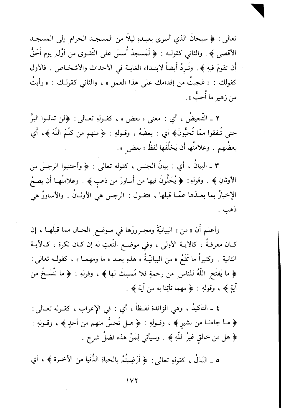 ِ تعالى {سبحانَ الذي أسرى بعبدهِ ليلاً من المسجد الحرامِ إلى المسجد الأقصى} . والثاني كقوله {لَمَسجدٌ أُسسَ على التّقوى من أوَّلِ يوم أَحَقُّ أَن تقومَ فيهِ} . وتَرِدُ أَيضاً لابتداء الغاية في الأحداث والأشخاص. فالأول كقولك "عَجبتُ من إقدامك على هذا العمل"، والثاني كقولك "رأيتُ من زهير ما أُحبُّ".